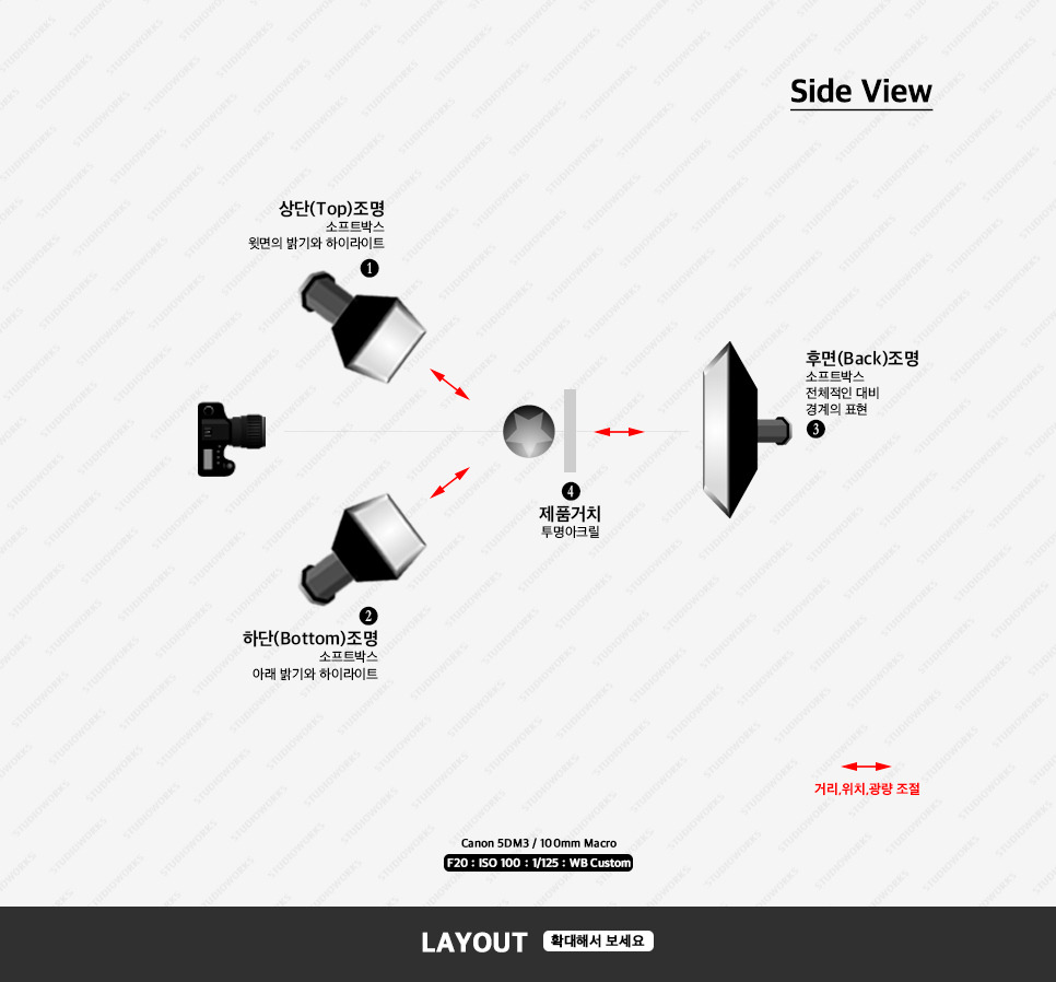 형광등을 가로로 거치하였기 때문에 조명을 위 아래로 배치했으나 형광등을 세로로 거치 하였다면 조명을 좌우로 배치하여 촬영해야 합니다.