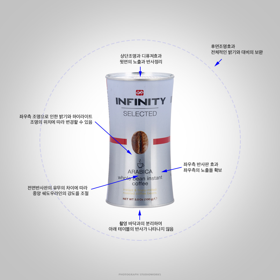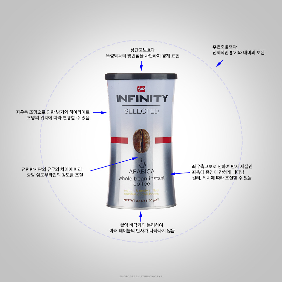제품의 특성이해 - 이번 촬영 제품인 커피콩 캔의 경우 원통형을 유지하고 있지만 각으로 제작되었습니다. 이런 류의 제품을 촬영할 때는 하이라이트 라인을 각진 특정 부분에만 나타나도록 해야만 깨끗한 느낌으로 표현될 수 있습니다.