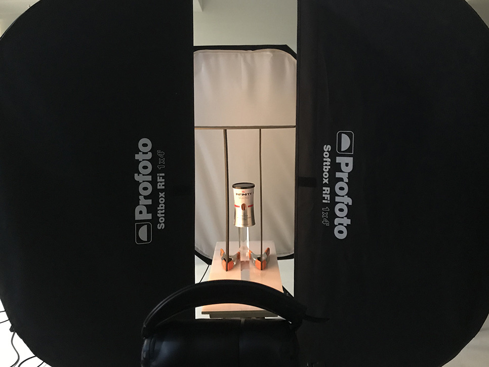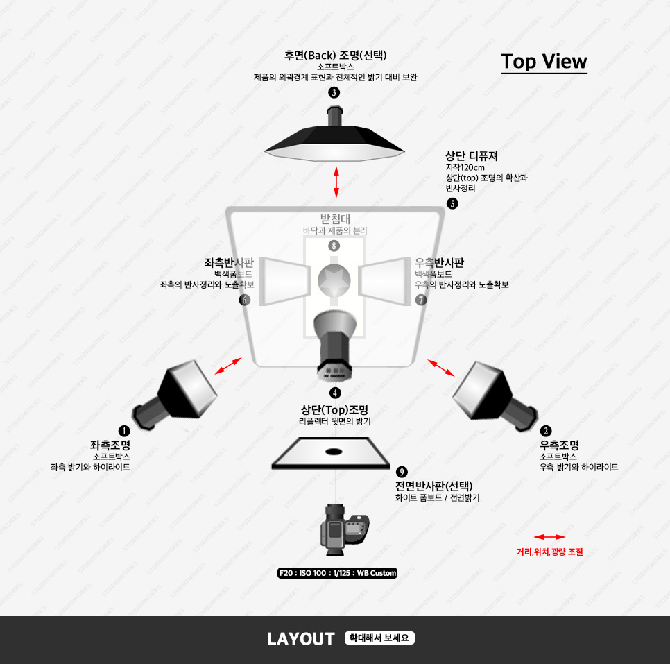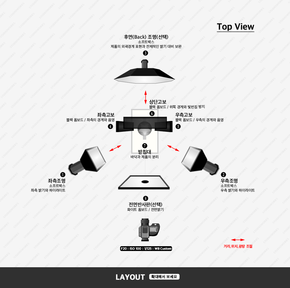 - 제품의 좌우에 표현되는 하이라이트와의 노출차를 적게 만들기 위하여 백색 반사판을 사용함. ( 앞서 설명한 고보를 사용할 때와는 다른 느낌으로 표현됨)