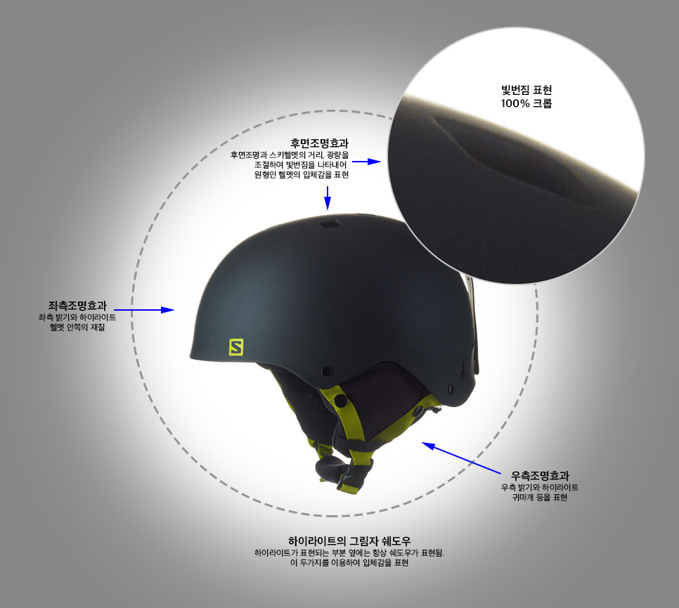 작은 사진에는 보이지 않지만 원본을 보면 스키헬멧의 외곽 경계에 빛번짐이 나타남. 빛번짐을 이용하여 헬멧의 원형 입체감 표현