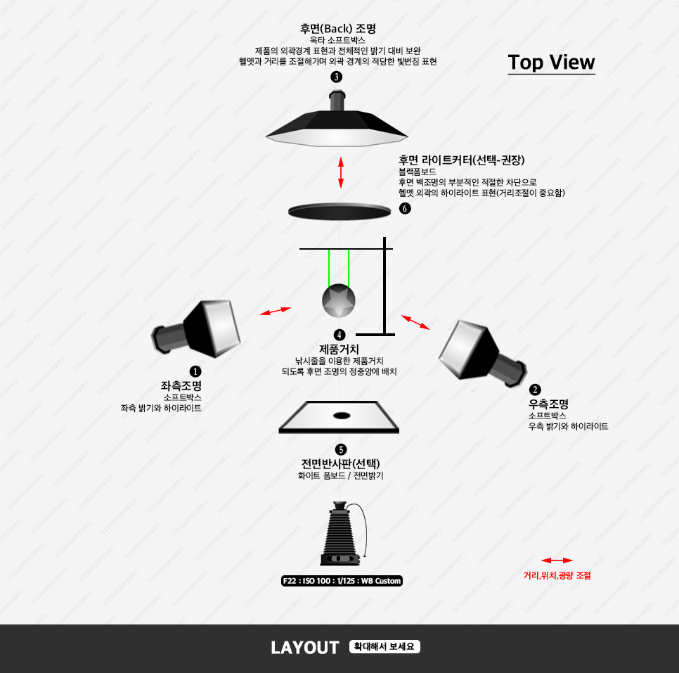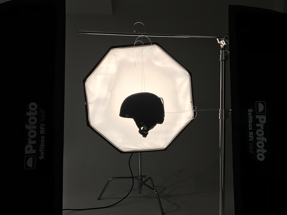 3. 후면 Back 조명(옥타 소프트박스) - 스키헬멧의 외곽 경계와 전체적인 밝기, 대비의 보완. 빛번짐을 이용하여 헬멧의 입체감을 표현하므로 조명과의 거리, 광량 등이 중요한 포인트 . 또한 이번과 같이 동그란 형태의 제품 촬영 시 제품 모양과 비슷한 모양의 광원(옥타 소프트박스)을 사용하기를 권장.