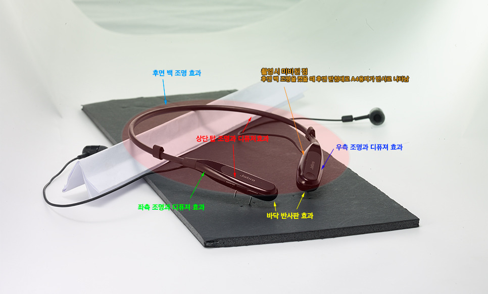 넥밴드 좌측 부분에 중점을 두고 촬영, 우측은 후보정(합성)으로 이어폰 부분과 선을 따로 촬영 ( 하나로 촬영하려고 이리저리 거치해봤지만 도저히 불가함.특히 선부분은 두께가 있다면 다른 방법이 있지만 너무 얇아 방법이 없음)