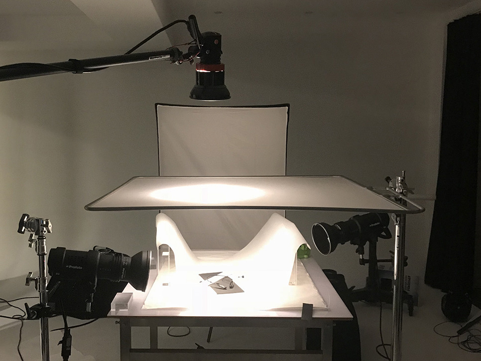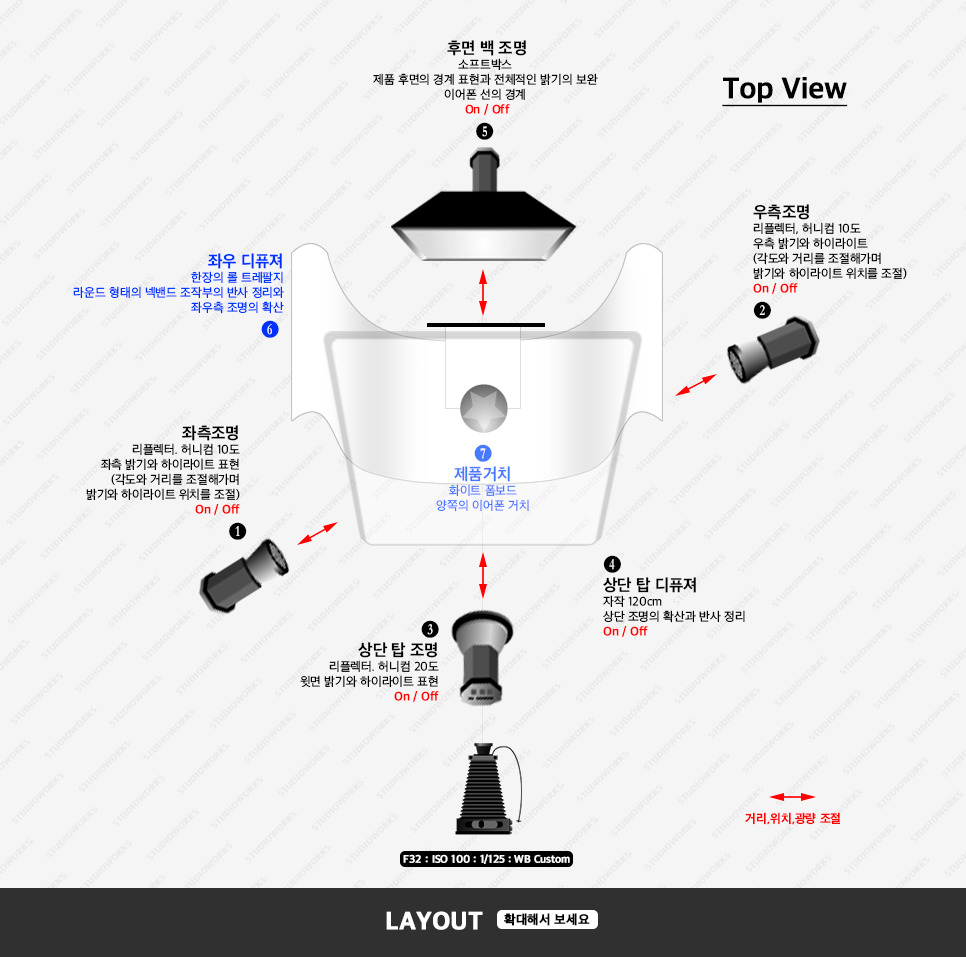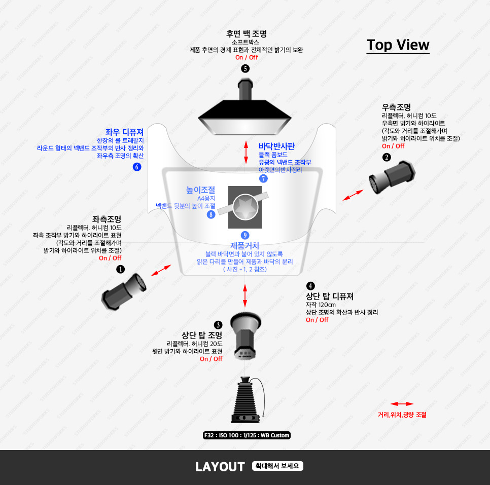 5. 후면 백 조명(소프트박스) - 제품 후면의 경계의 표현과 전체적인 밝기의 보완.(필수적인 요소가 아니므로 촬영자의 선택)