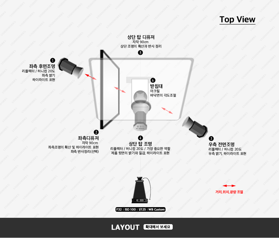 4. 상단 탑 조명(리플렉터, 허니컴 20도) - 전체적인 밝기와 가위의 질감, 하이라이트 표현.
