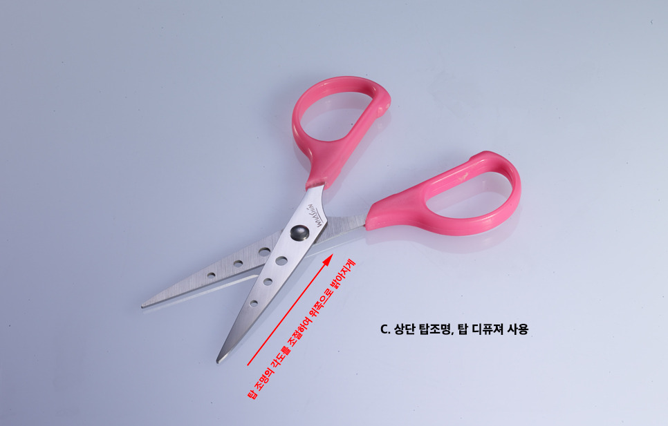 C. 탑 조명과 디퓨져를 사용했을 때 -가위의 전체적인 밝기와 가위 윗면의 질감의 표현. 탑 조명과 디퓨져의 각도를 조절하여 가위 아래부분에서 위쪽으로 점점 밝게 표현함.