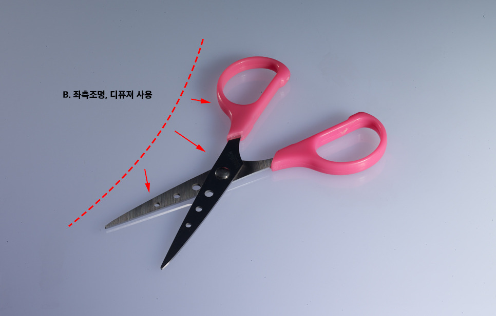 1. 좌측 후면 조명(리플렉터, 허니컴20도) - 가위의 좌측 밝기와 질감 표현(아래 사진 참조)