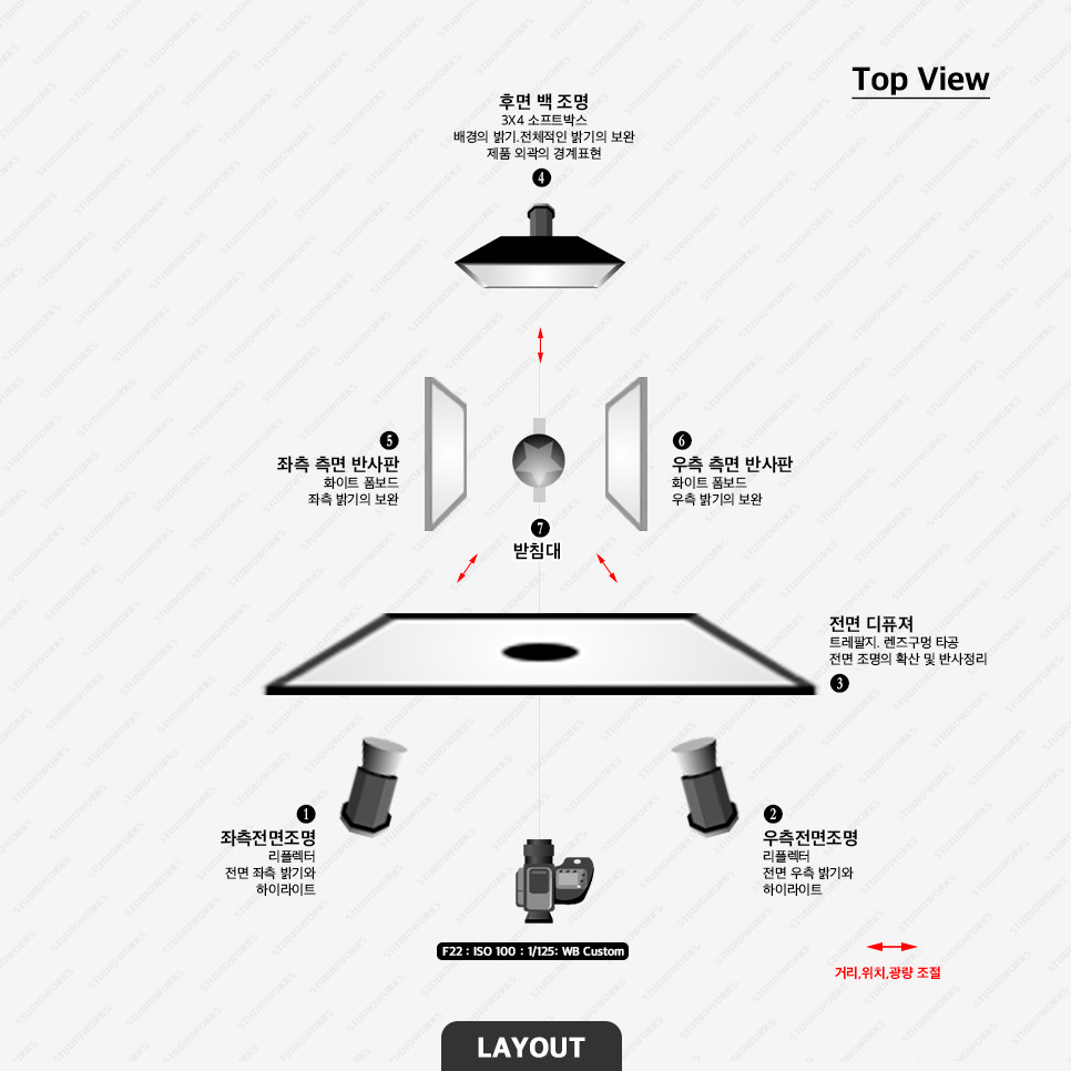 1. 좌측 측면 조명(소프트박스) - 좌측 측면의 밝기와 하이라이트 표현