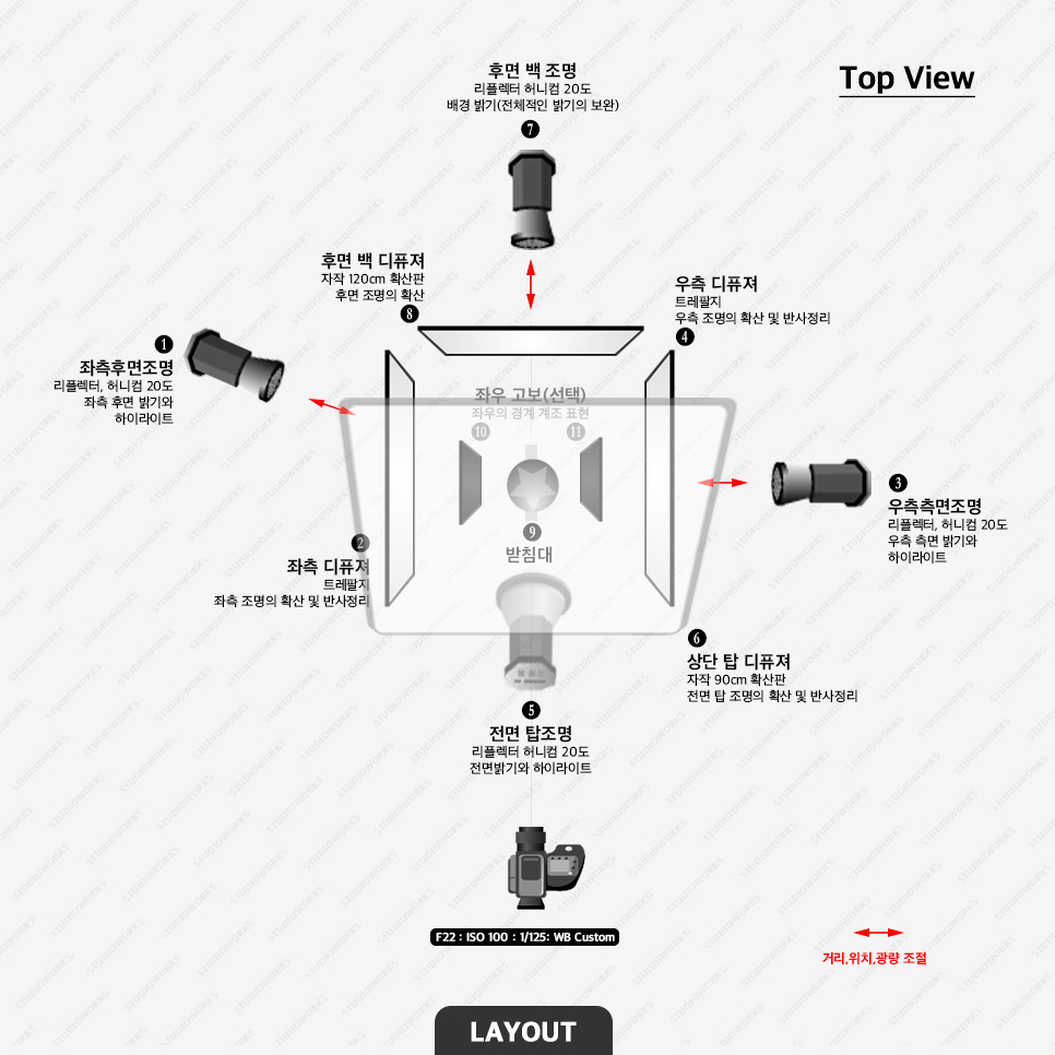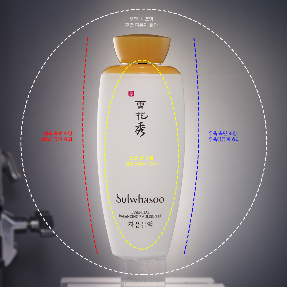 백색 제품의 경우 조명을 통한 배경과 제품의 분리, 계조를 이용한 입체감을 표현해야 하기 때문에 조명의 컨트롤이 가장 중요함