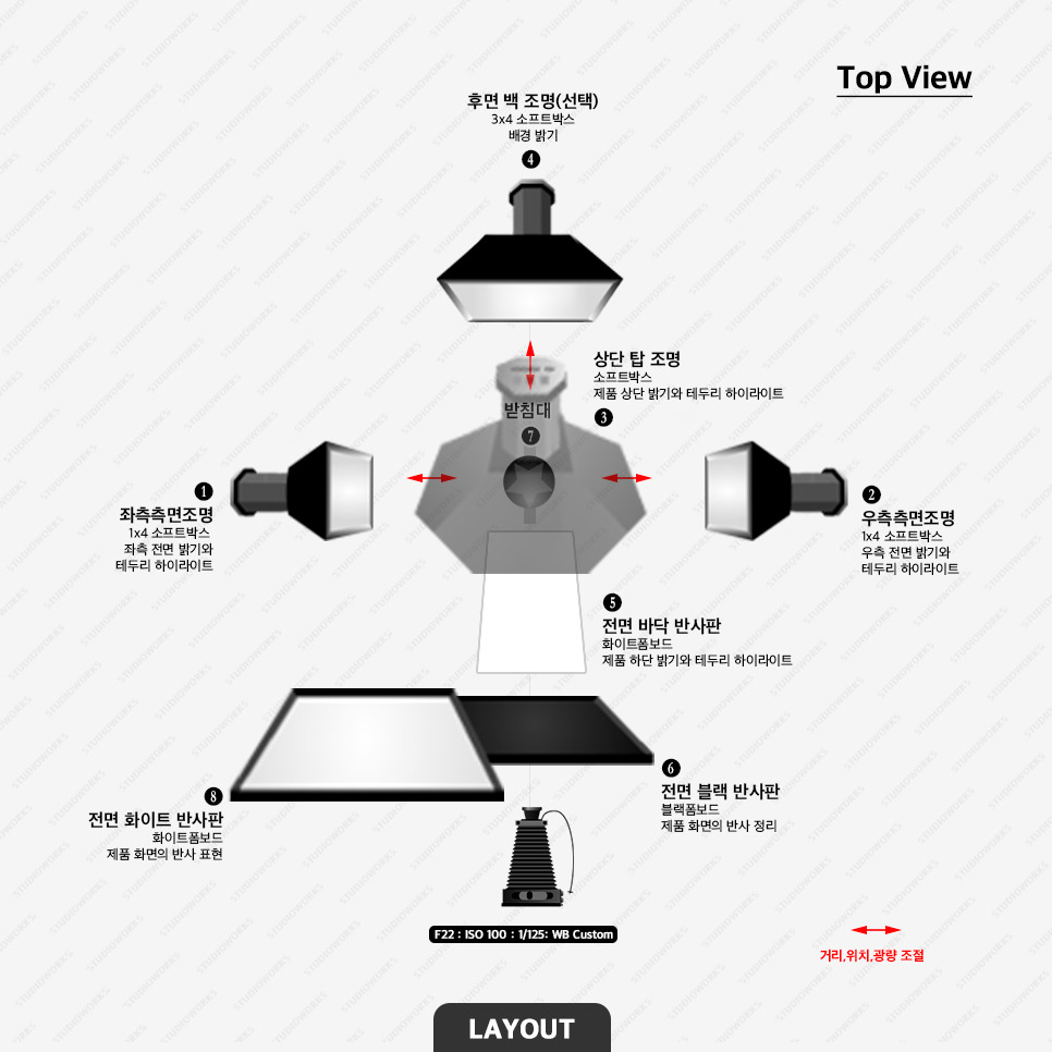 5. 전면바닥반사판(화이트폼보드) - 하단 밝기와 하이라이트. (조명 배치가 가능하다면 조명을 사용해도 됨 )