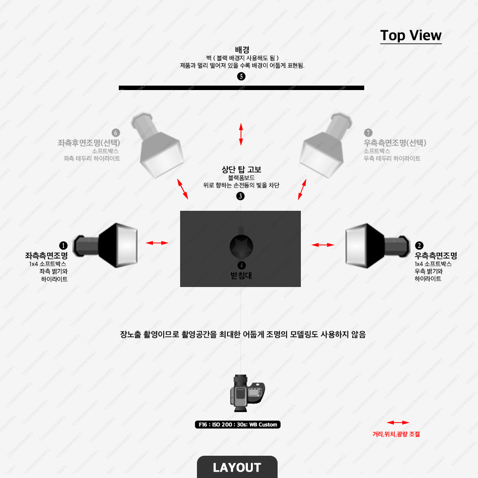 - 좌우측 후면 조명 사용 시 제품과의 거리로 하이라이트의 크기를 광량으로 하이라이트의 세기를 조절해야함. 제품 앞 쪽에 표현되는 하이라이트보다 선명하지 않고 밝지 않게 표현하기를 권장. 이번 촬영에는 사용하지 않았음.