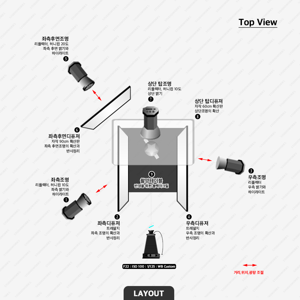 조명, 디퓨져, 블랙 유광 아크릴 촬영테이블, 카메라와 삼각대, 노출계