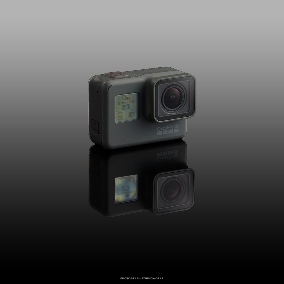 촬영포인트 - 사각형 모양의 고프로 제품 모서리(엣지)에 하이라이트, 렌즈의 컬러 플레어, 바닥면에 제품의 선명한 반영