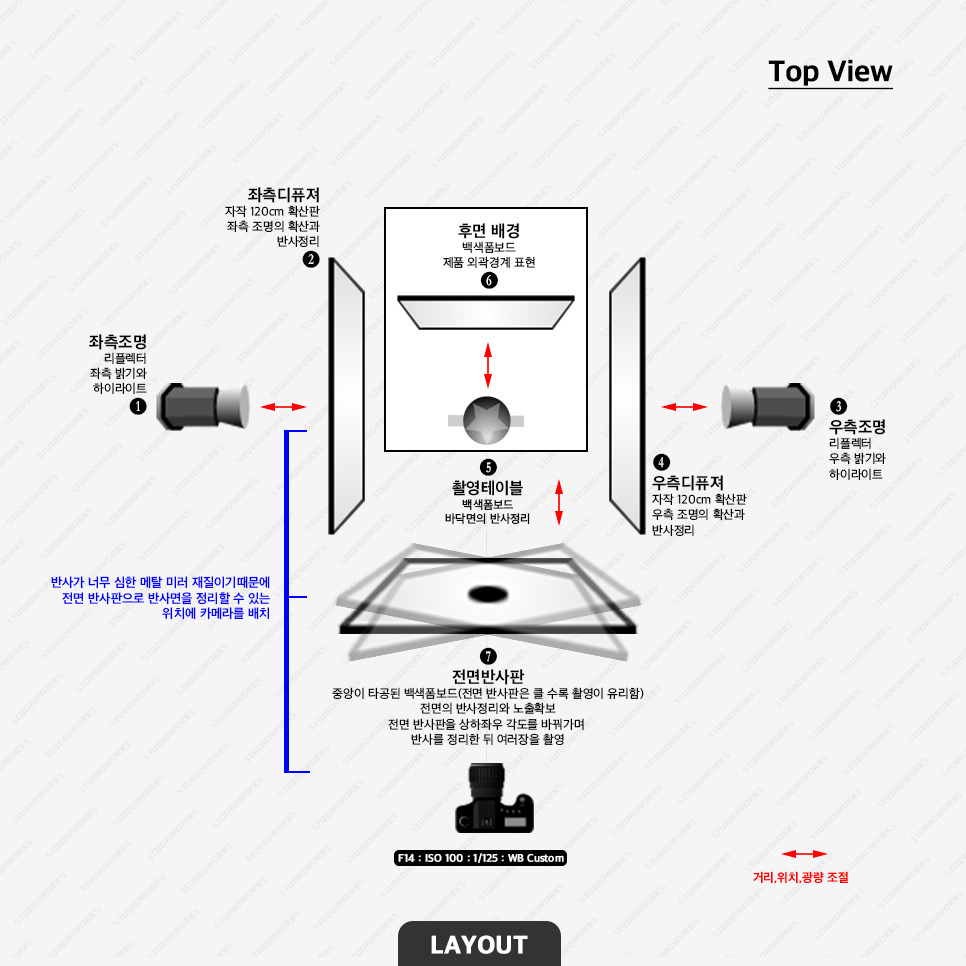 5. 촬영테이블(백색폼보드) - 메탈미러 재질 제품의 바닥면 반사정리 및 노출 확보. ( 제품 면이 고르지 못한 제품들은 촬영을 위한 거치가 상당히 중요한 요소입니다. 제품의 거치 위치를 변경하며 최적의 값을 찾아야 합니다.)(블랙폼보드를 사용해도 됩니다. 촬영자의 선택)