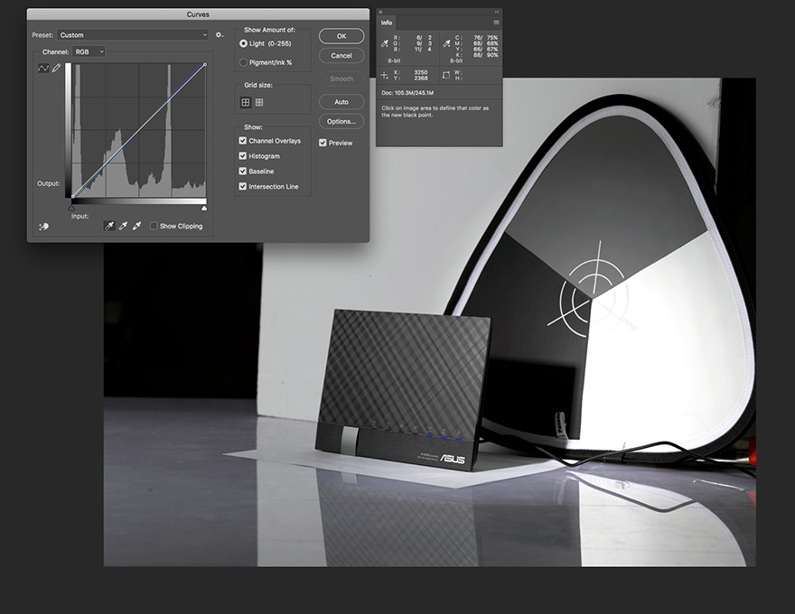 3. 백그라운드 - 제품의 경계를 보이기 위하여 대비되는 색상의 폼보드를 후면에 배치.