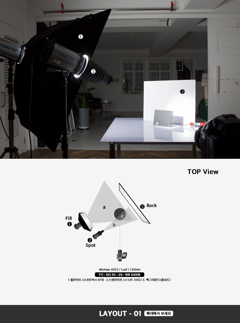 제품의 전체적인 노출은 조명기기의 광량을 조절하여 맞춤