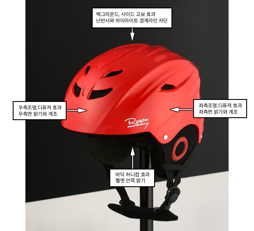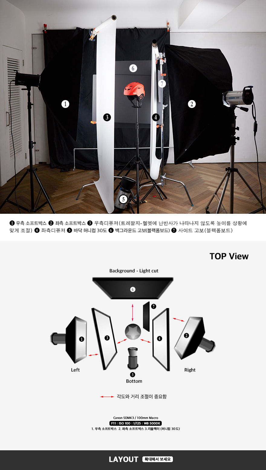 6. 백그라운드 고보(블랙폼보드) 7. 사이드 고보 - 원형 제품 촬영 시 조명으로 인한 난반사 차단 ( 은색의 C-Stand등 촬영등 주변 상황의 난반사가 헬멧의 후면에 나타나는 것을 차단, 좌,우측 조명 영향으로 헬멧 후면에 하이라이트 경계라인이 나타나는 것을 방지 )