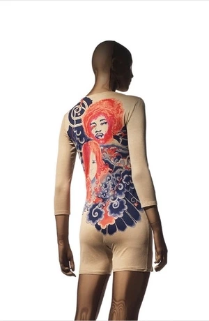 위 사진은 이세이 미야케 첫 컬렉션에서 선보인 작품이다. 일본 전통 타투 이미지를 활용해서 지미 헨드릭스와 제니스 조플린의 모습을 표현하고 있다. 당대의 가장 위대한 두 뮤지션이 1970년 27세의 나이로 나란히 세상을 뜨자 가장 일본적인 표현기법으로 그들의 죽음을 애도하였다.
