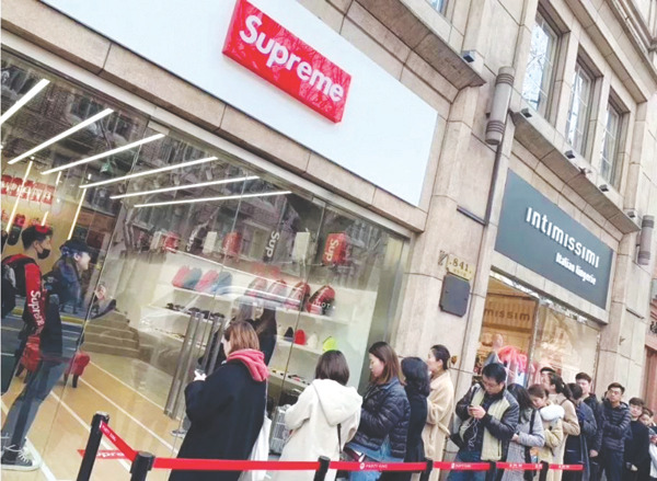 뉴욕 슈프림의 드롭데이에 득템한 럭키가이들(왼쪽). 서울 루이비통 매장에서 슈프림 출시를 기다리는 사람들(가운데). 상하이 가짜 슈프림 매장앞에 줄서 있는 사람들(오른쪽)