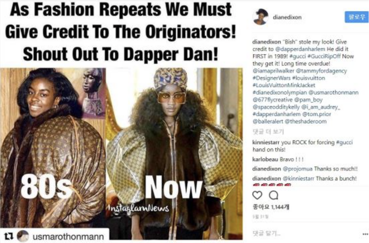 루이비통을 무단 도용한 대퍼 댄, 그리고 대퍼 댄을 표절한 구찌(왼쪽). 2018 구찌 X 대퍼 댄 콜라보래이션 컬렉션 (오른쪽)