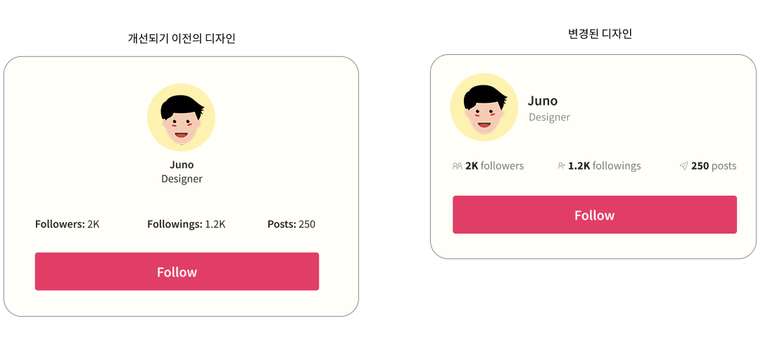 만약 디자인을 개선하는 데 참여했다면, 개선된 디자인과 함께 원래 디자인을 나란히 보여주세요.