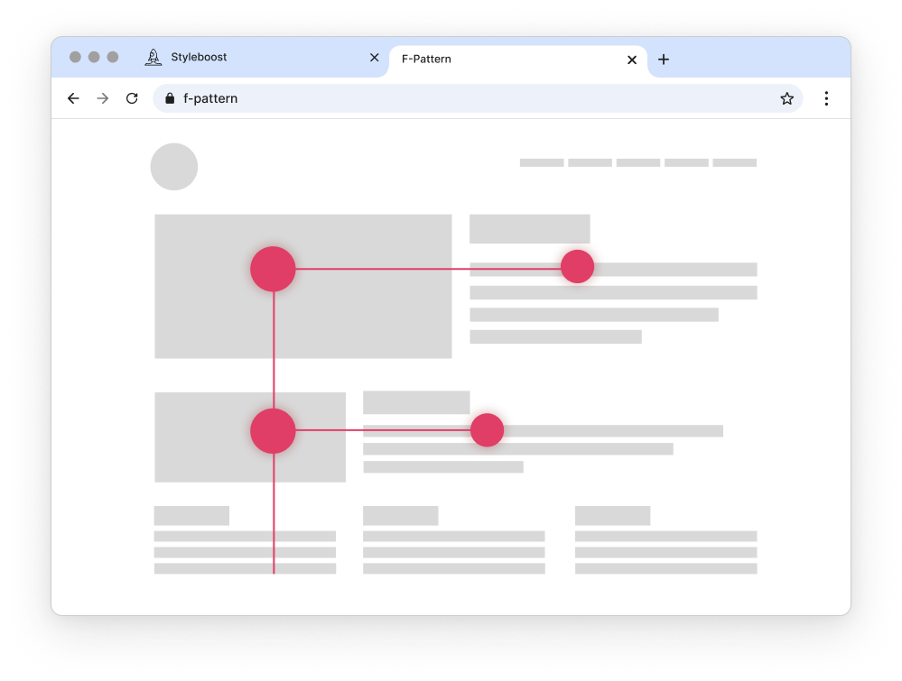 사람들은 웹페이지를 볼 때 일반적으로 F자 형태의 시선 흐름을 보입니다. 먼저 페이지 상단을 가로로 훑어본 뒤, 아래로 내려가 짧게 가로로 다시 시선을 옮깁니다. 마지막으로 페이지 왼쪽을 따라 아래로 시선을 이동시키는 경향이 있는데, 이런 방식은 글이 많은 페이지에서 흔히 나타납니다.