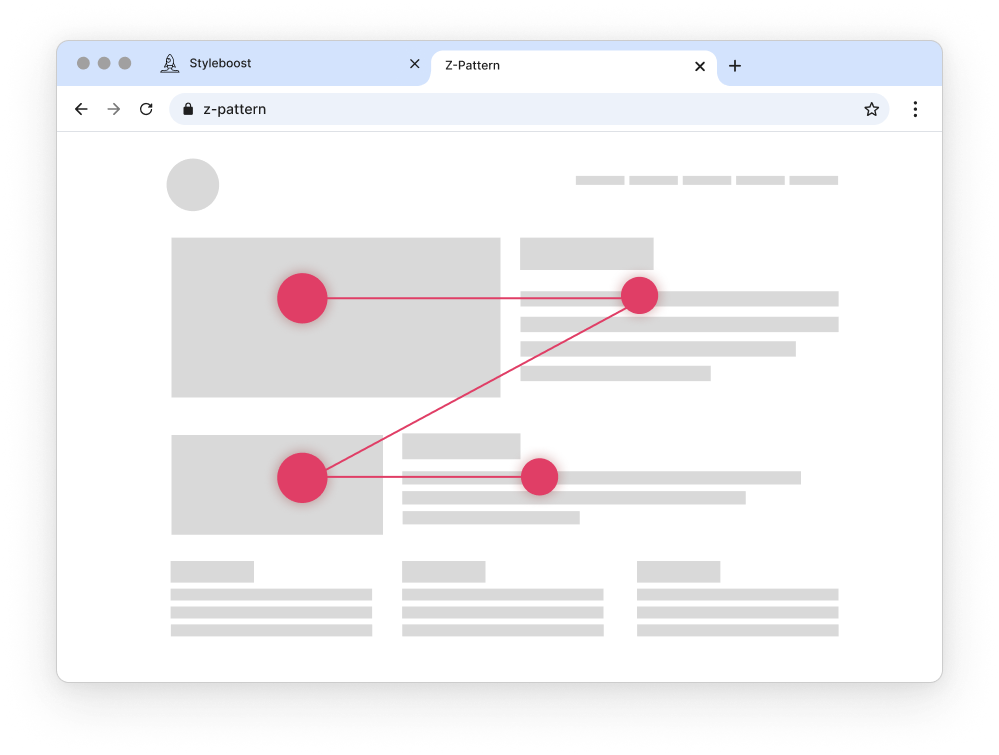 Z 패턴 스캔은 주로 텍스트 위주로 구성되었지만, 균일하게 정렬되지 않은 페이지에서 나타납니다. (텍스트 콘텐츠가 많은 기사나 검색 결과 페이지에서는 F 패턴이 더 효과적입니다.)