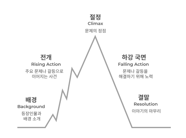 [1] ‘스토리 마운틴 (Story Mountain)'이나 스토리 맵 (Story Map)은 플롯의 일련의 사건들을 시각화하고 이해하는 데 도움을 줍니다. 산 모양으로 시각화된 이 이야기는 정점이나 극복해야 할 장애물을 향해 고조되다가, 산의 반대편으로 내려오며 갈등이 해소되고 결말을 맺는 구조를 가집니다.