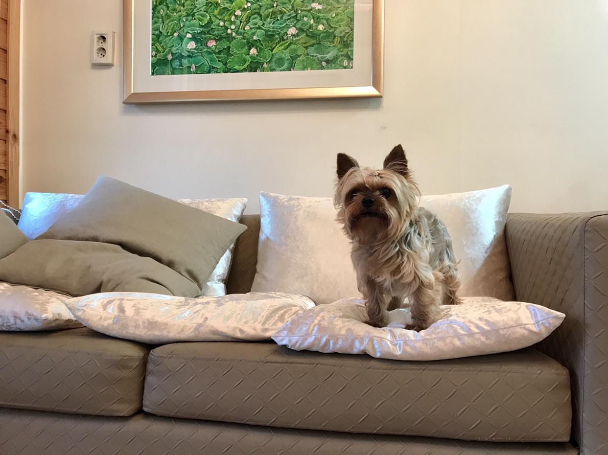 간단히 짐 정리를 하고 3박 4일 동안 우리 가족의 휴식 공간이 될 공간을 둘러 보았다. 콩돌이도 여기저기 둘러보다 소파에 편하게 올라가 앉았다. 겨울에 부산에 있는 애견동반 호텔에 갔을 때는 좀 불안해 하고 밖에서 나는 소리에도 예민하게 반응했는데 이 곳에서는 다행히 잘 적응하고 편안히 잘 지냈다. 강원도는 확실히 시원했다. 집에서는 밤에도 에어컨을 틀고 잤는데 여기서는 에어컨을 안 켜도 시원했다.