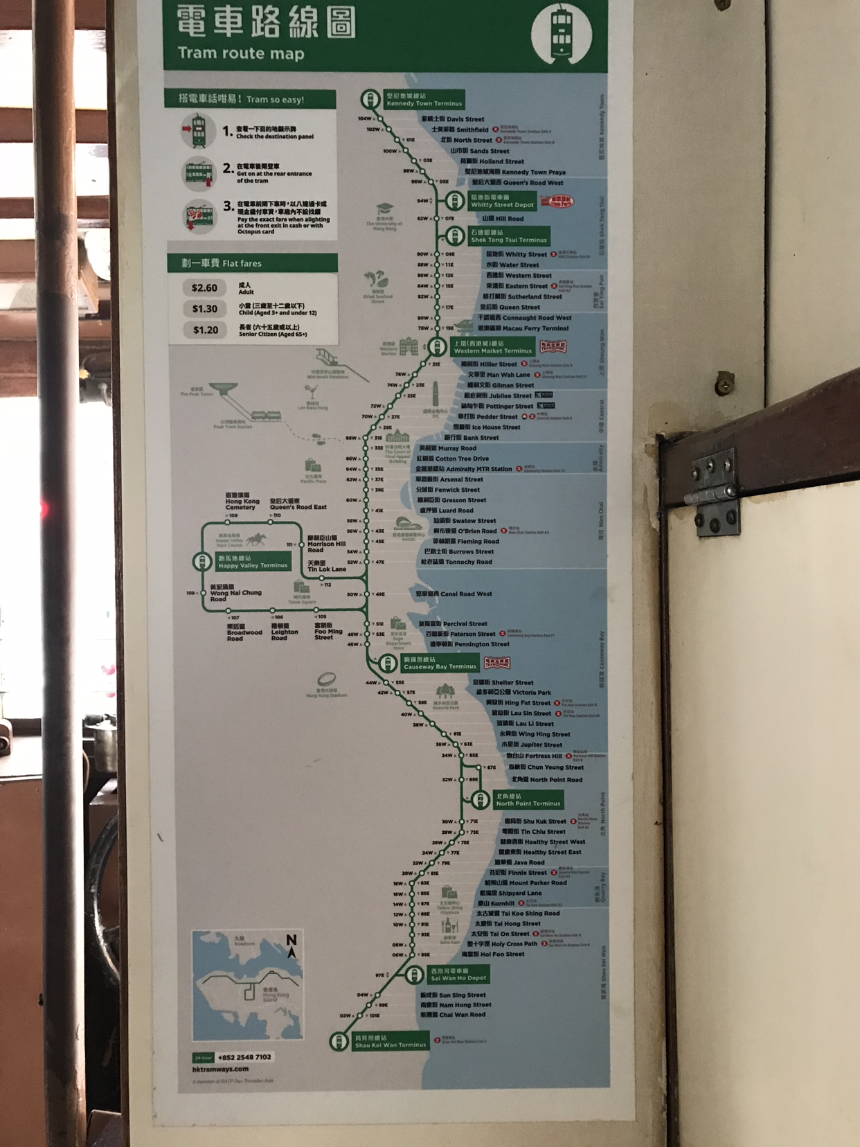 트램은 홍콩섬에만 다니고 구룡반도에는 없다. 홍콩섬에서 구룡반도로 넘어가는 일정이라면 가기 전에 꼭 타 봐야 한다. 요금은 400원 정도로 저렴하며 내릴 때 옥토퍼스 카드를 찍으면 된다.
