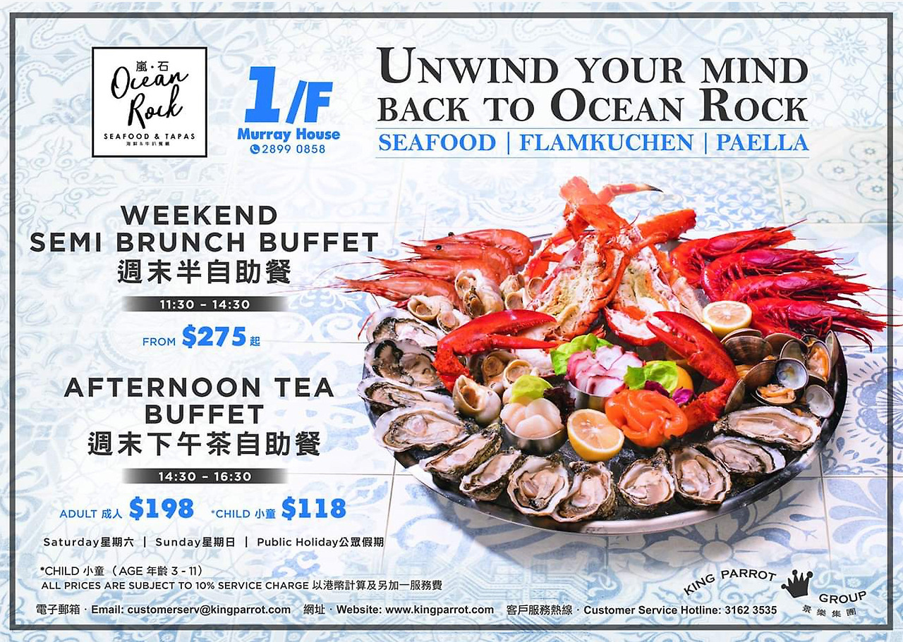 머레이 하우스 2층, 오션락 시푸드 앤 타파스에서는 주말 점심시간에 시푸드 뷔페를 즐길수 있다. 1800년대 석조건물에서 즐기는 시푸드 부페는 홍콩에서만 즐길 수 있는 색다른 경험. 시원하게 뚫린 발코니석에 자리 잡으면 한 눈에 들어오는 스탠리 해변을 즐기며 식사할 수 있다. 메인 메뉴를 선택하고 샐러드, 시푸드, 디저트를 뷔페식으로 마음껏 즐길 수 있다. 탄산수 등 음료는 별도. 요금을 추가하면 와인 뷔페도 즐길 수 있고, 식사 후에는 커피나 차를 서비스해 준다.