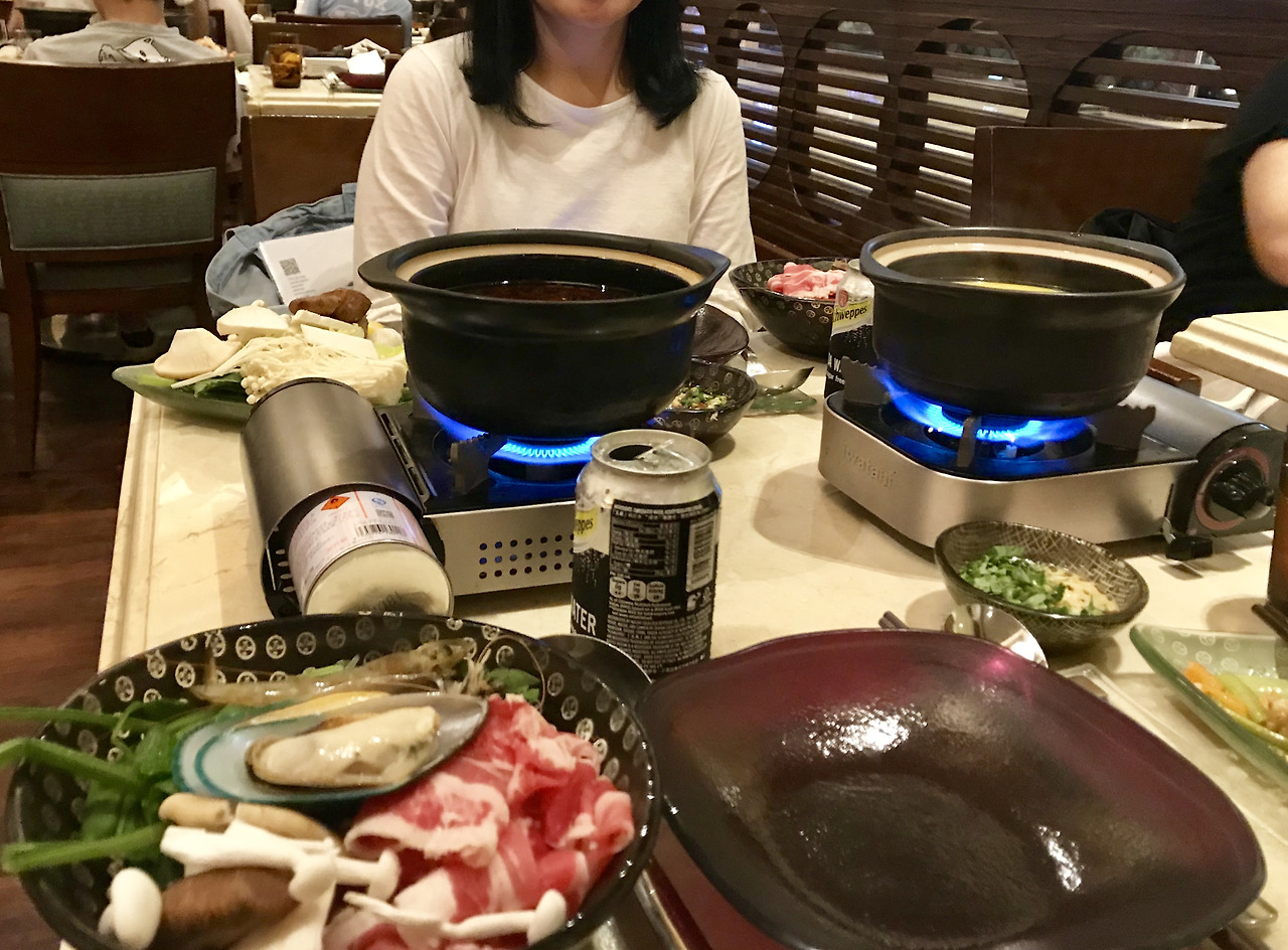 많은 사람들이 추천해 줬던 쉐라톤 훠궈뷔페. 점심 시간에 가니 많은 사람들로 북적인다. 자리를 안내받고 1인 훠궈냄비에 선택한 탕이 담겨 나왔다. 백탕과 홍탕을 각각 주문했다. 흔히 보는 반으로 갈라진 훠궈냄비가 아니라 뚝배기 같은 데에 탕이 담겨 나오는 점이 특이하다. 해산물과 고기종류, 버섯, 채소 등 훠궈에 넣을 수 있는 재료들을 뷔페식으로 담아다가 먹는다. 음료와 소스, 볶음밥 등 간단한 중식요리와 디저트 코너도 있다.