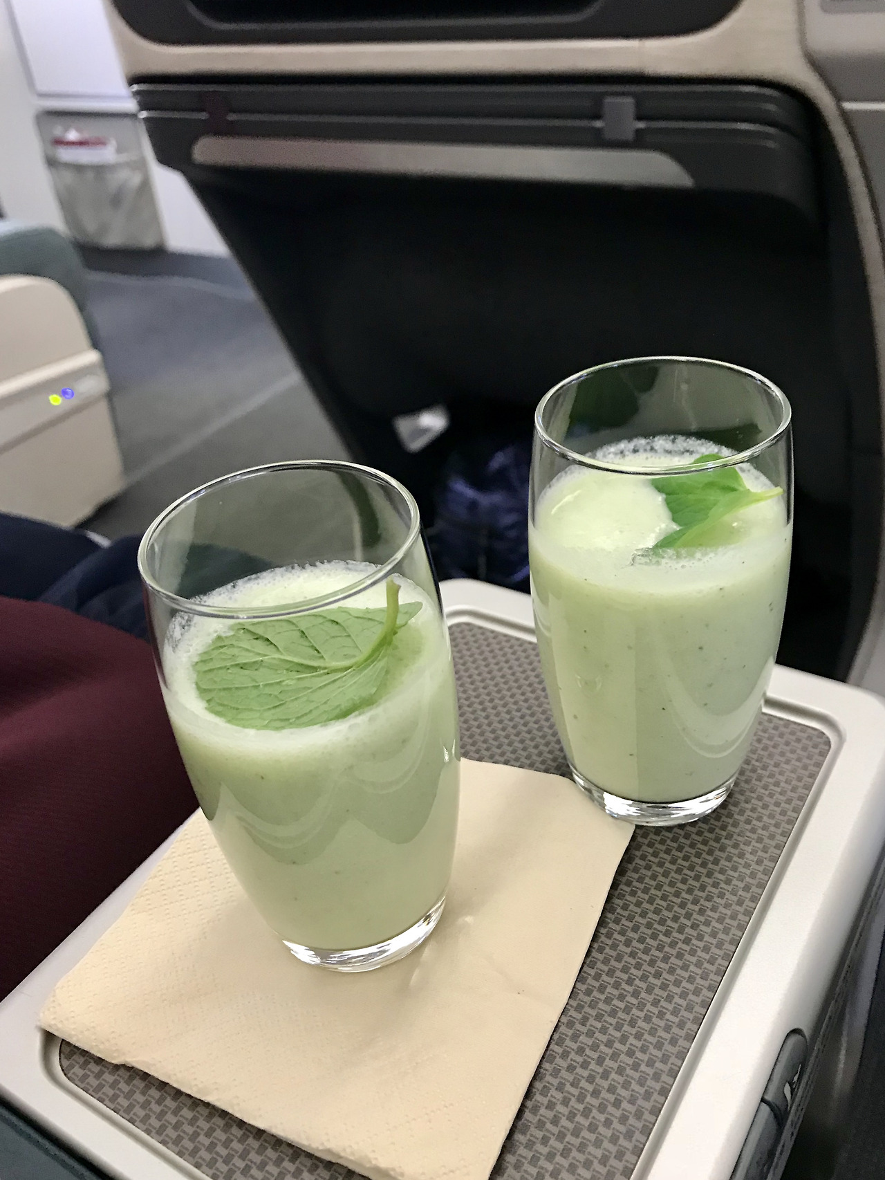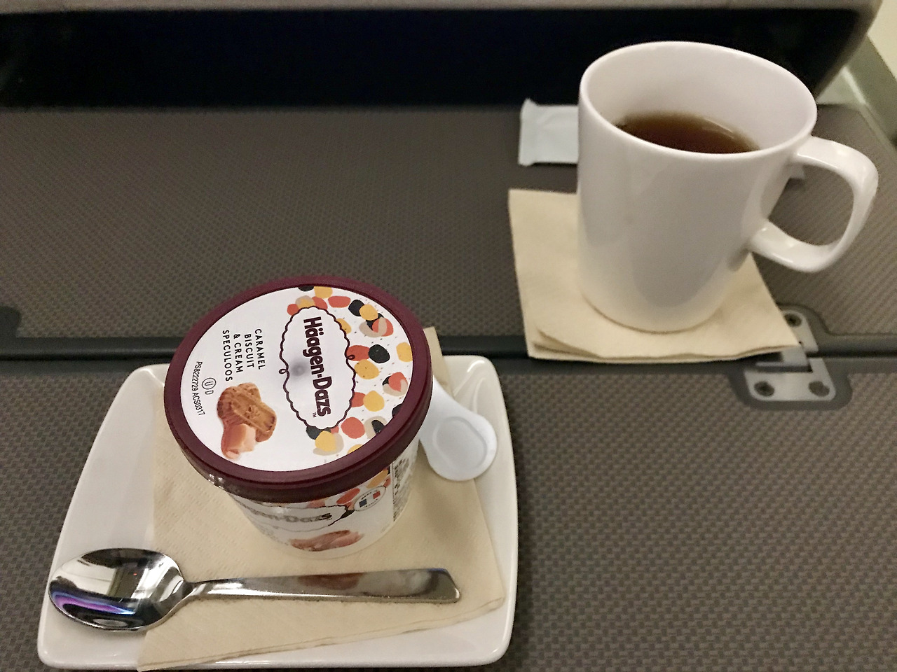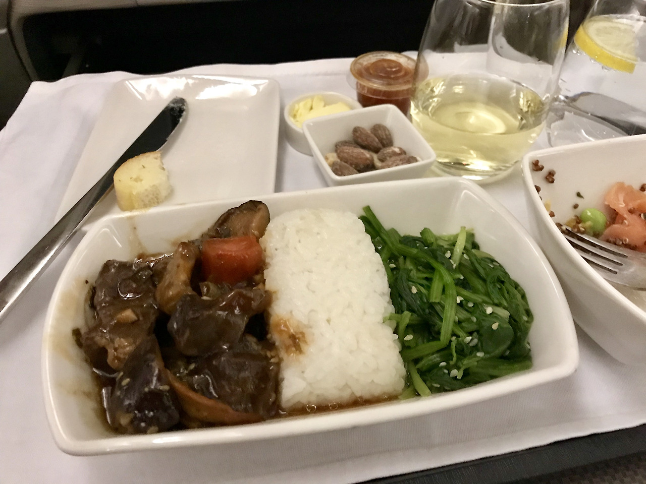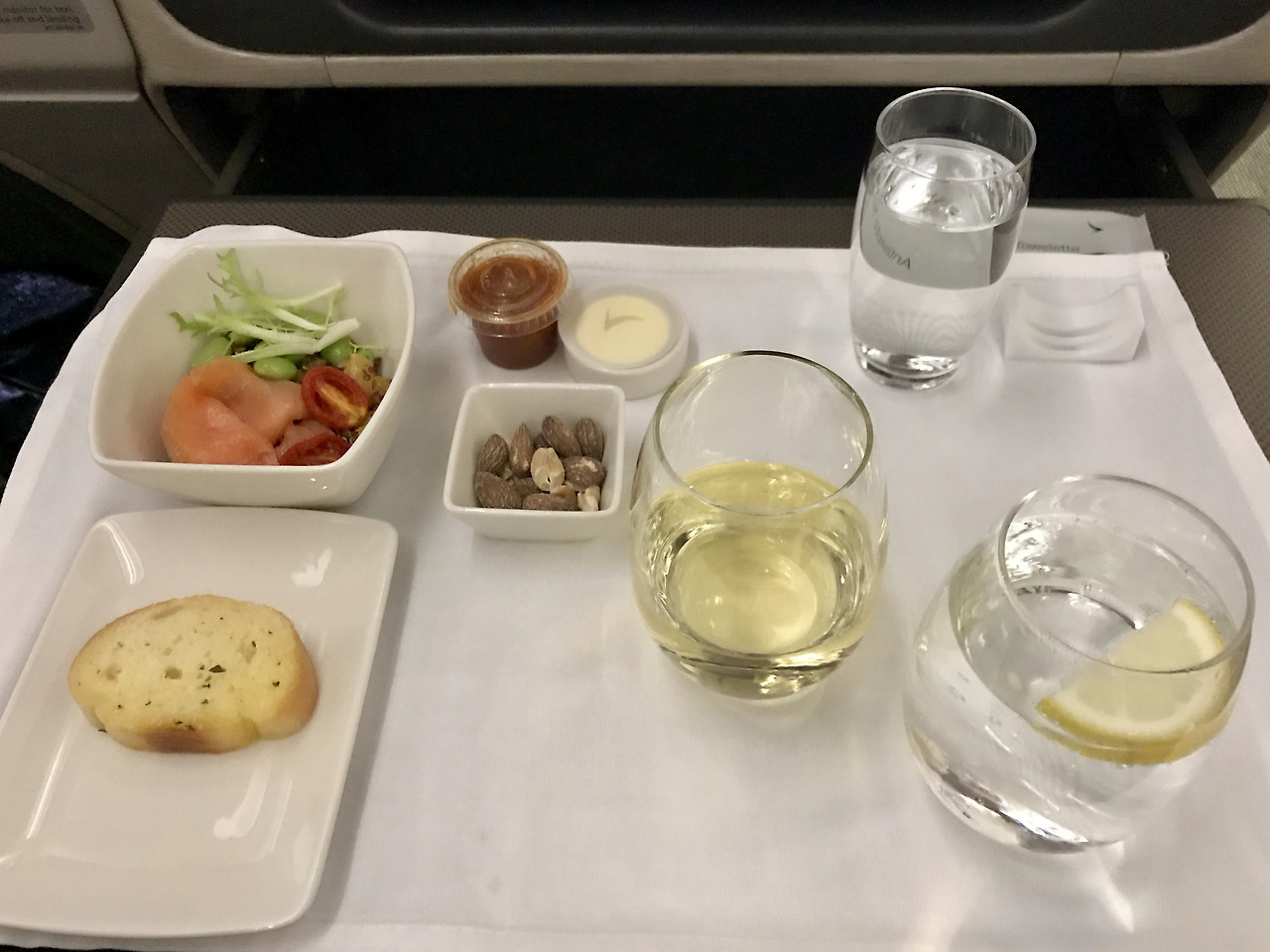 대만에서 인천으로 돌아올 때는 저녁 5시 출발이었다. 저녁 메뉴로 키위쥬스, 연어샐러드, 와인, 소고기 또는 생선, 아이스크림, 커피와 티가 나왔다. 메인으로 소고기를 주문했는데 이코노미에 나오는 메뉴랑 별 차이 없었고 밥이 덜 익었는지 딱딱해서 다 남겼다. 연어 샐러드는 맛있었다.