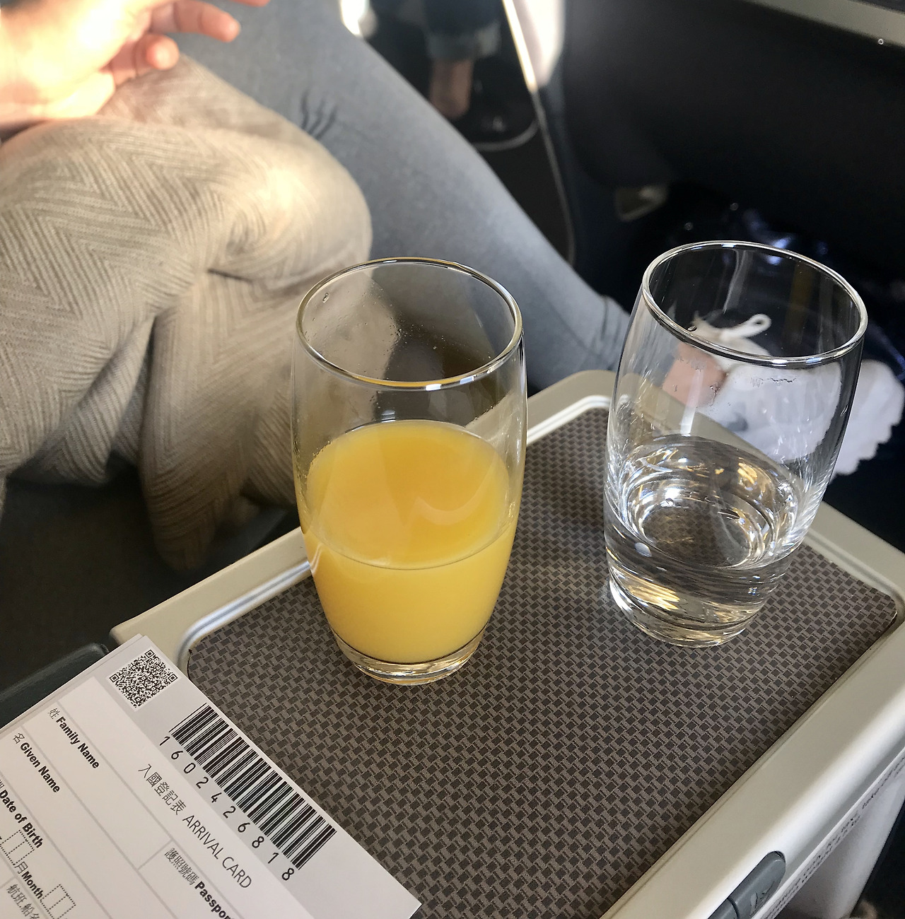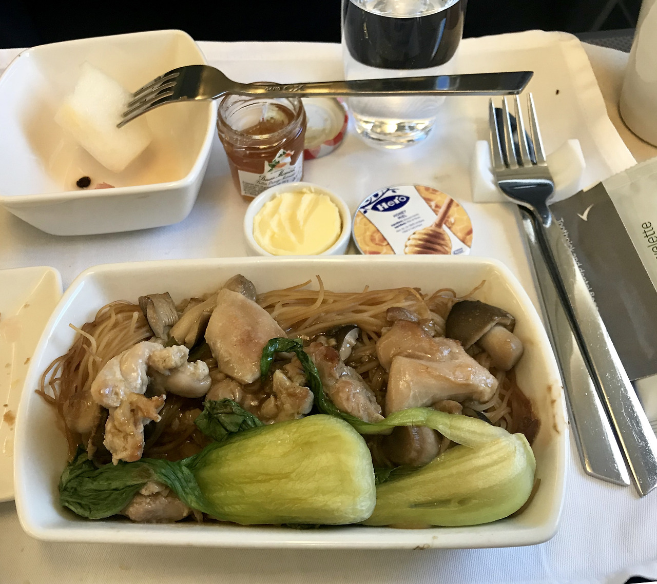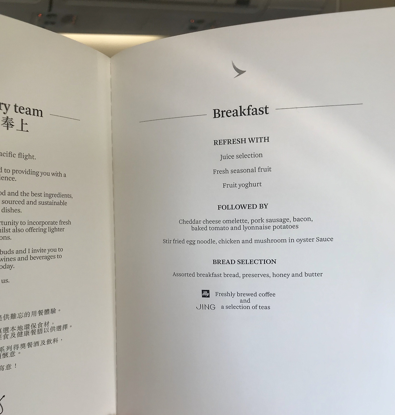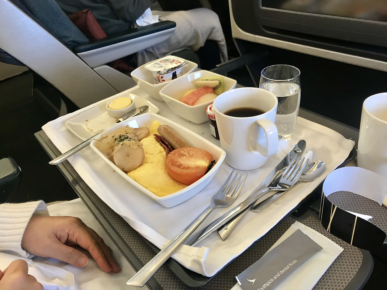 인천공항에서 아침 9시에 출발하는 노선이었고 아침식사가 제공되었다. 먼저 쥬스가 나오고 에피타이저로 과일과 요거트. 메인 메뉴는 오믈렛과 누들 중 선택. 빵과 버터, 커피와 티가 나왔다. 치즈나 아이스크림은 없었고 인천-홍콩 노선보다 메뉴가 간소했다.