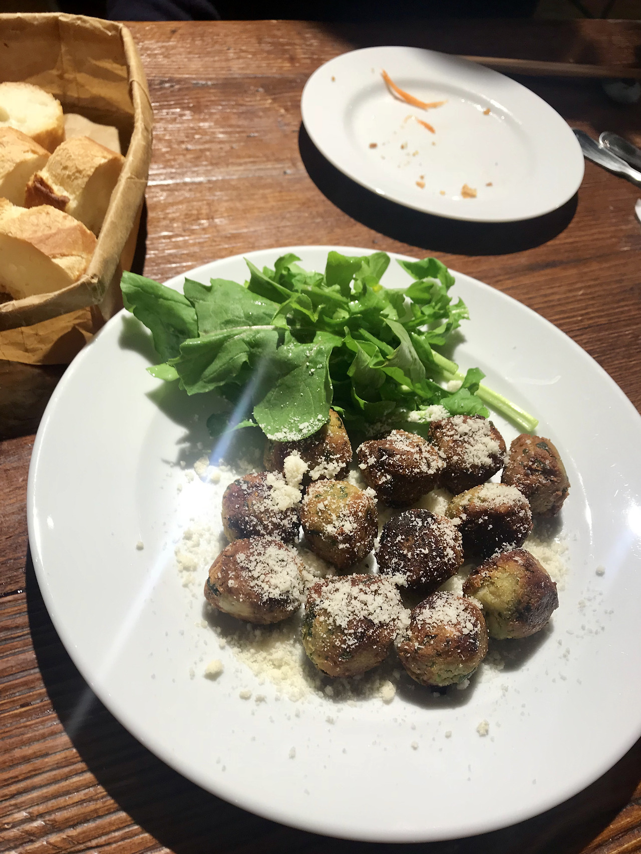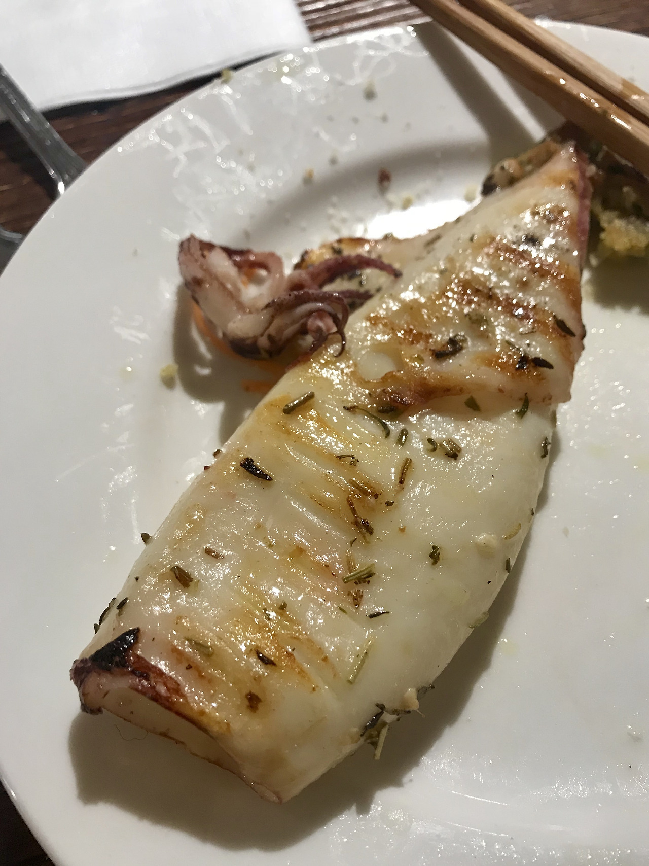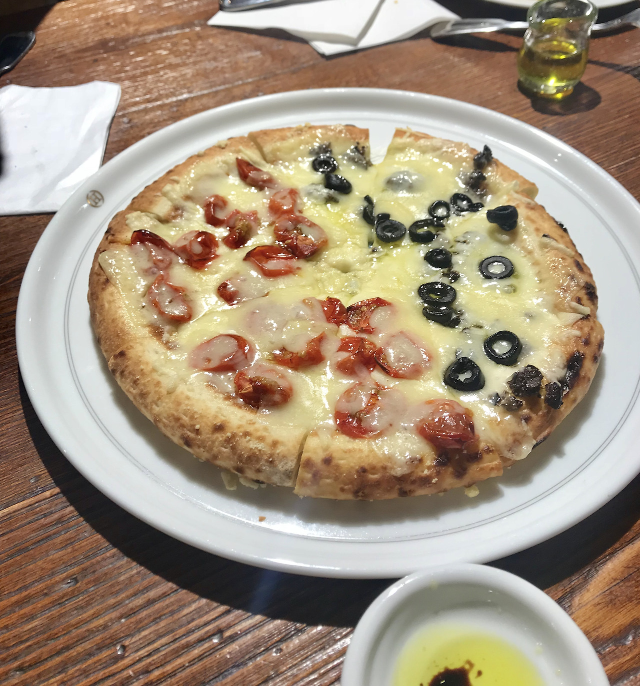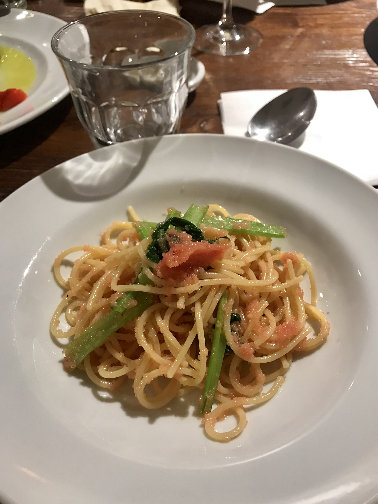 메인 요리로는 콩으로 만든 완자와 오징어, 피자와 파스타가 나왔다. 피자는 재료가 많이 들어간 것도 아닌데 치즈 맛이 풍부하고 정말 맛있었다. 피자 위에 루꼴라를 얹어 먹을 수 있게 따로 주었다. 명란 파스타도 짠 맛 없이 고소했다. 메뉴는 지인이 모두 알아서 주문해 주었는데 고기를 좋아하지 않는다는 것, 굴, 명란을 좋아한다는 것을 미리 알고 입맛에 맞게 요리해 주었다.