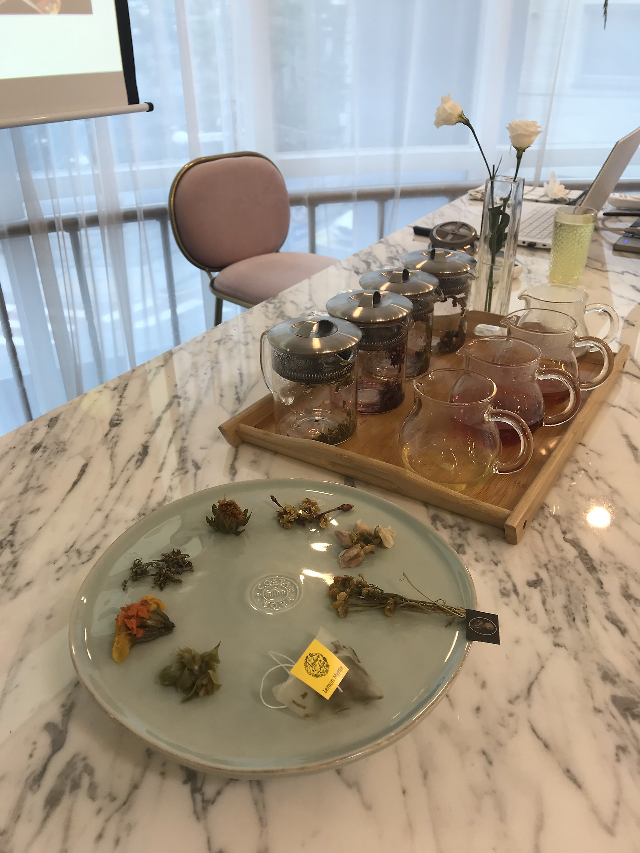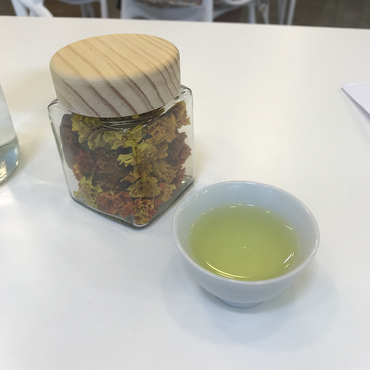 티클래스 시간에 시음한 한국 허브차는 홍화차, 쑥꽃차, 생강꽃차, 금잔화차.