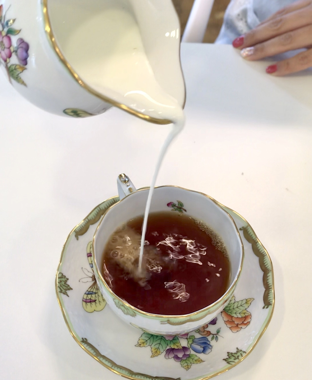 차에 실온상태의 우유를 첨가하기 때문에 온도가 내려간다.