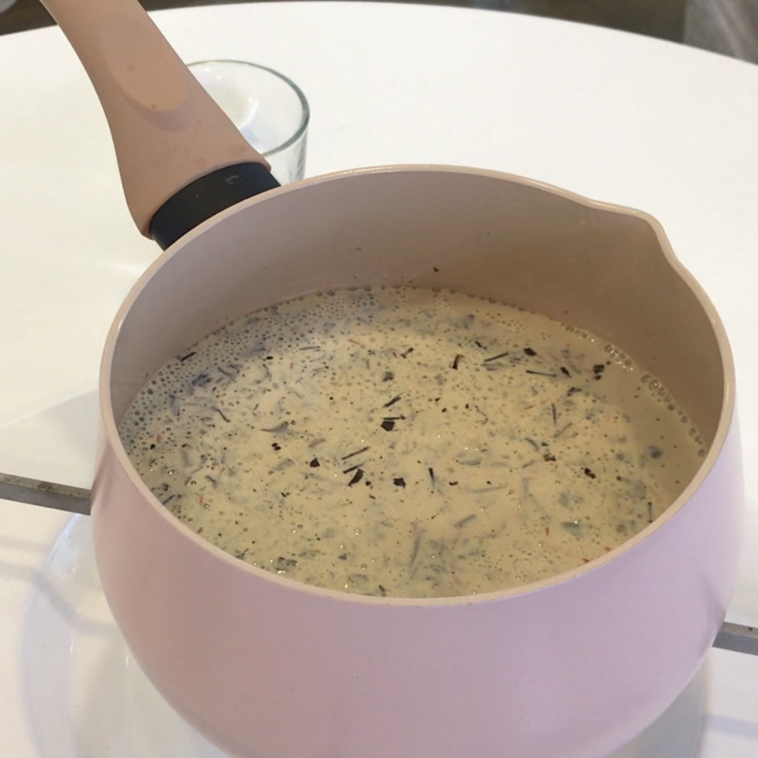 찻잎이 우러나고 물이 거의 없어지면 우유를 한 컵 넣고 끓인다.
