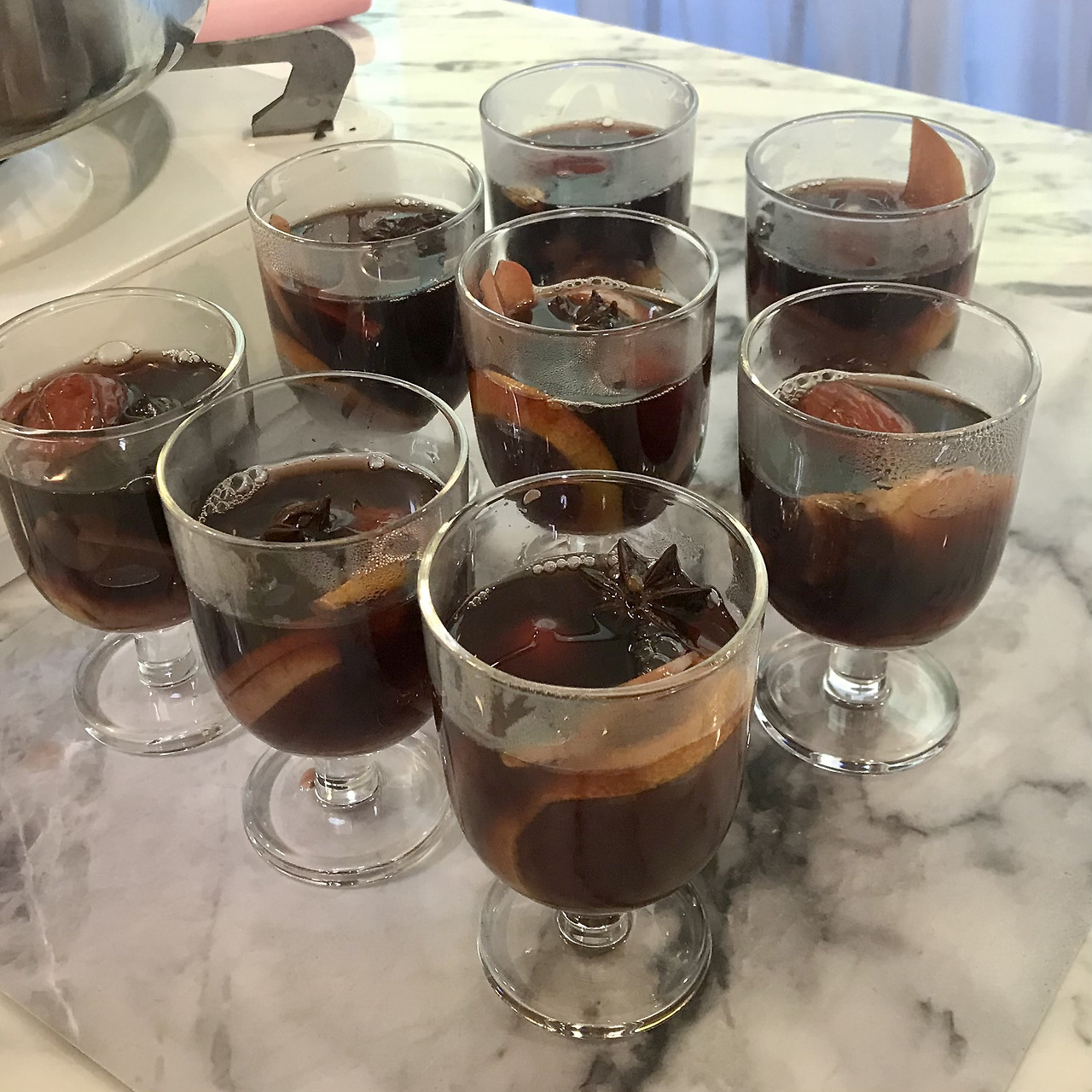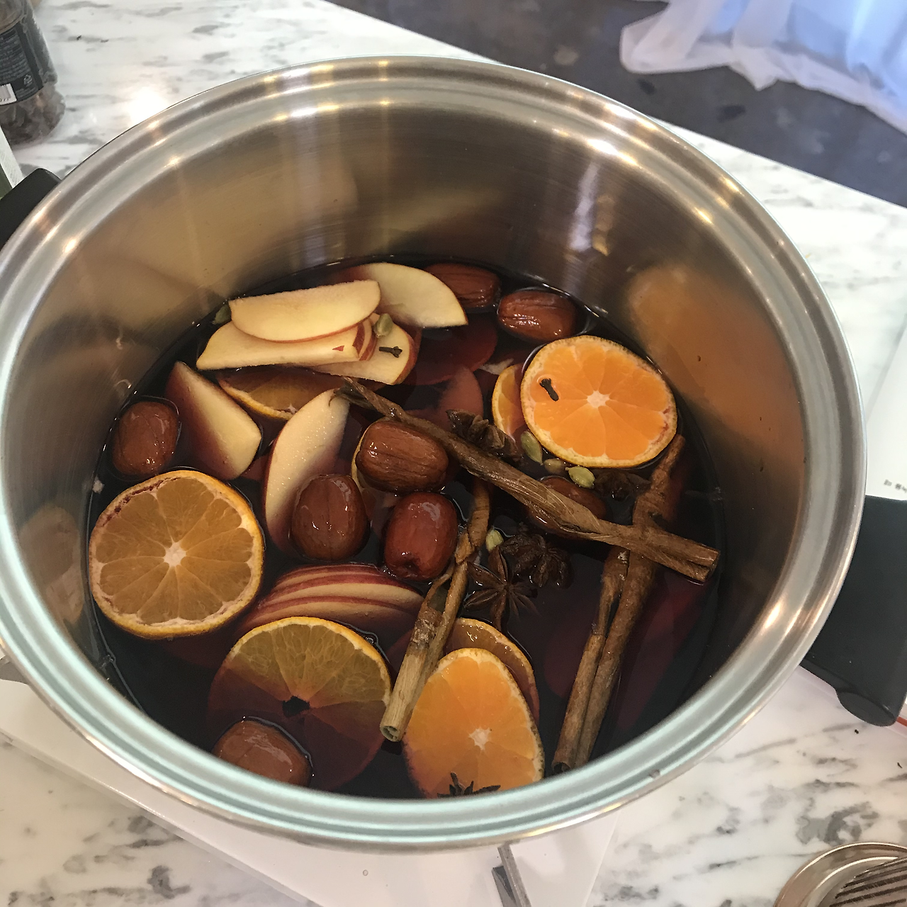 만들기: 냄비에 와인, 과일과 시나몬 스틱, 향신료(팔각, 정향, 커디멈 )를 넣고 끓인다. 티팟에 차이 티를 진하게 우린다. 우려낸 티를 냄비에 붓고 섞는다.