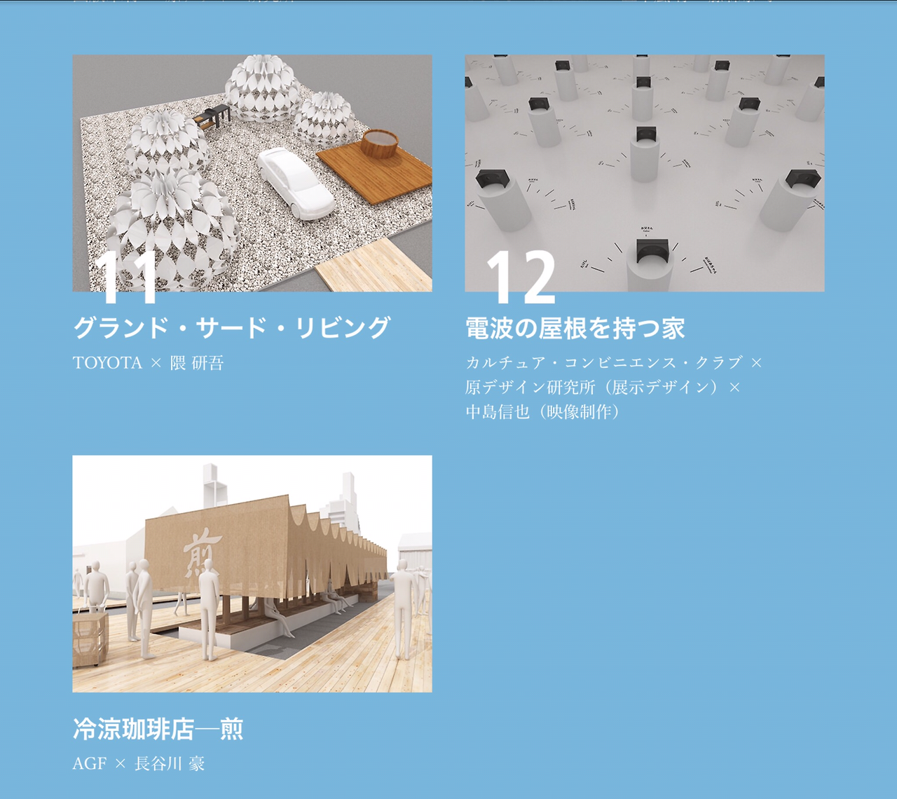 스마트폰 서비스 회사인 CCC는 가족을 만드는 요인은 물리적 '집의 지붕'이 아니라 '전파의 지붕' 이라고 말한다. 후쿠오카에 사는 할머니와 도쿄의 가족이 스마트폰 서비스를 통해 긴밀하게 연결된다. 전파의 지붕 아래 가족이 연결되고 단말기로 의사소통도 가능하다. 전시장에서는 VR에 따라 희비가 엇갈리는 '전파의 지붕에 의한 인간드라마'를 볼 수 있다.