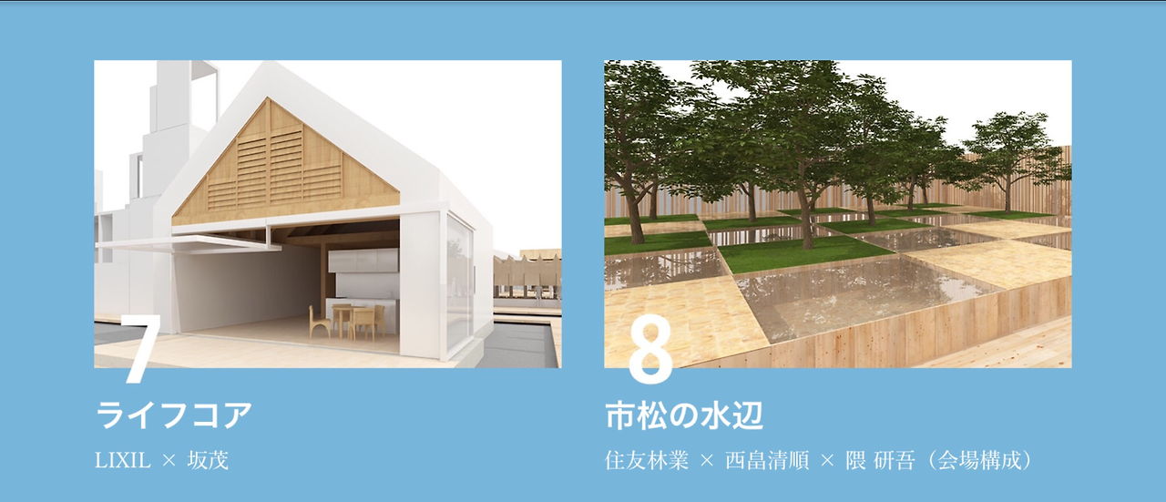 바둑판 모양 물가는 집이 아니라 나무와 물로 구성된 휴식 공간이다. 올림픽을 염두에 두면서 8월의 도쿄 오다이바에 물과 접할 수 있는 새로운 식물 공간을 실현하고자 했다. (2020 도쿄 올림픽 엠블렘도 바둑판 무늬로 되어 있다)