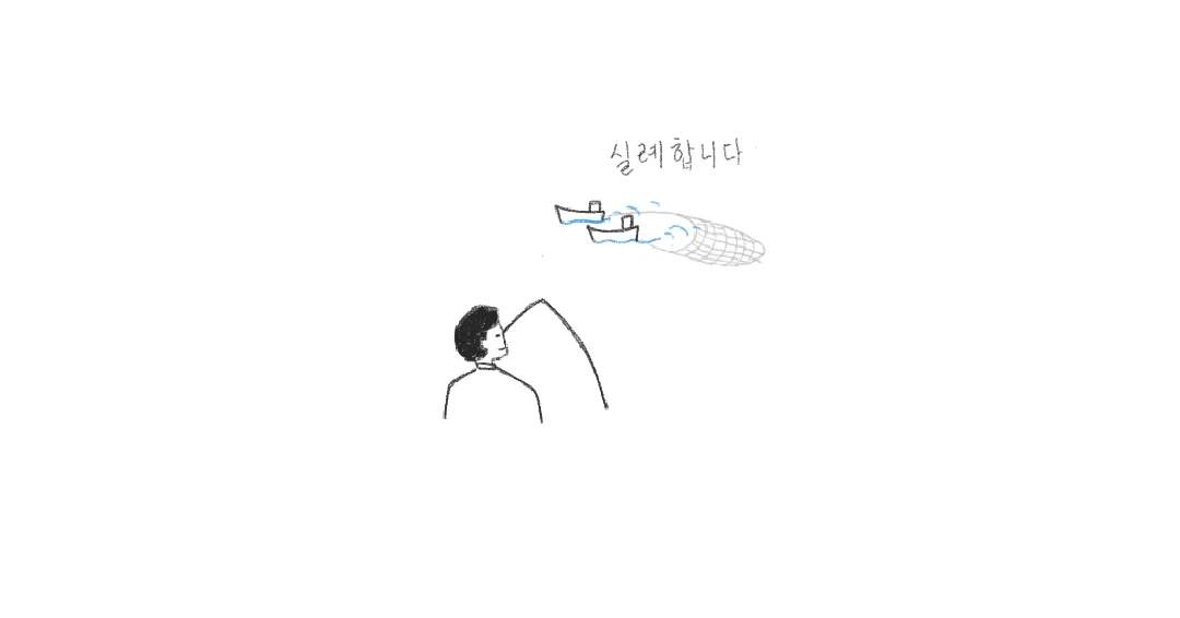 두 척이 쌍을 지어 서로 딱 붙은 채 일정한 속도로 항해하는 어선들을 '쌍끌이 어선'이라고 부른다. 그들은 각자의 선미에 어망의 끝단을 한쪽씩 매달아 두고 바다를 이리저리 휘젓고 다닌다. 어선 사이에서 뒤쪽으로 아치형을 그리며 주욱 빠진 그물망은 생각보다 그 길이가 길다. 그 당시 나는 그들의 뒤쪽으로 지나가려 했으므로 그대로 지나갔다간 그물을 건들고 지나갔을지도 모른다.