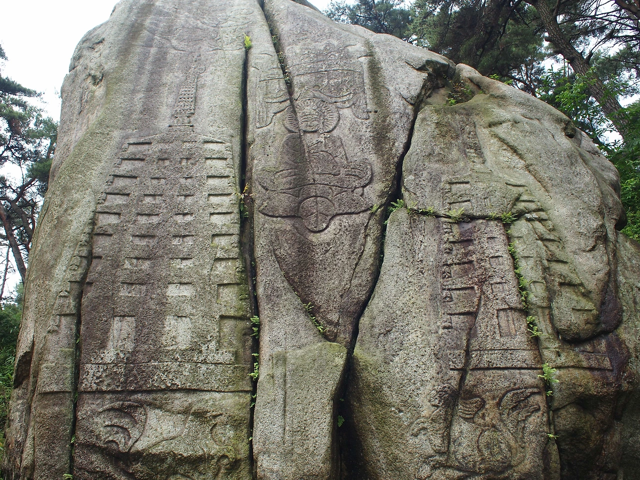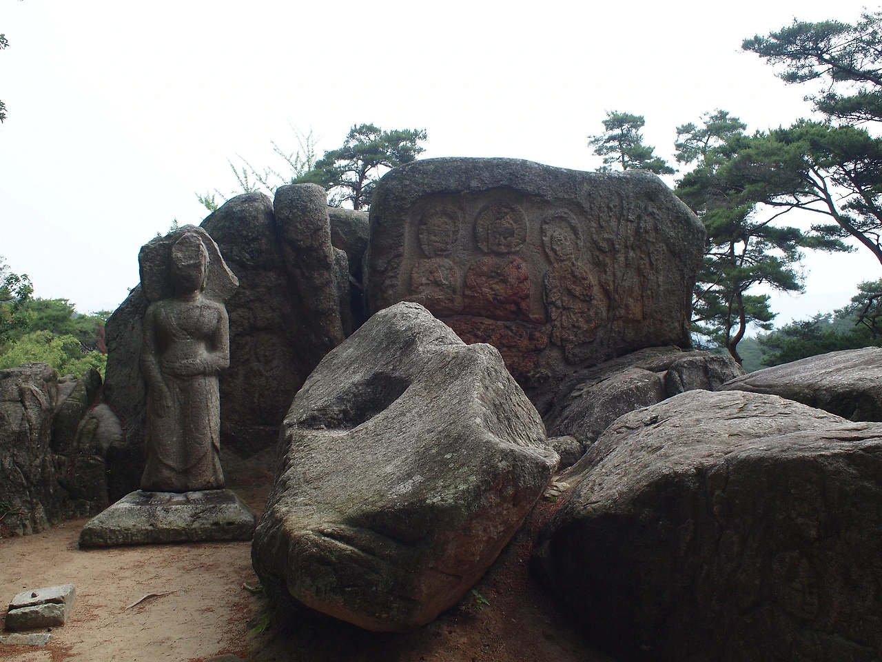 부처바위. 높이 9미터, 둘레 30미터의 거대한 바위 사면에 약 30여 개의 불교와 관련된 다양한 조각들이 새겨져 있어 그리 불리고 있다. 가장 먼저 보이고 가장 유명한 곳이 북면. 중앙으로 석가여래 좌상이 있고, 양쪽으로는 탑, 그리고 탑 밑으로 각각 한 마리의 사자가 지키고 있다. 무엇보다 두개의 탑 조각이 눈길을 끈다. 신라의 전형적인 3층 석탑이 아니라 목탑으로 보이는데 기단부, 탑신부, 상륜부가 완벽한 모습이다. 전문가들은 황룡사 9층 목탑도 이러한 형태가 아니었을까 추정하고 있다.