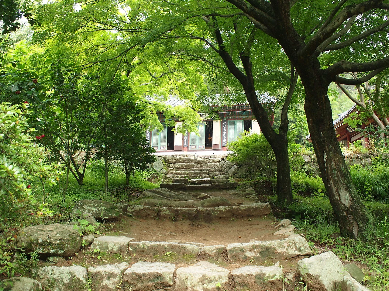그렇게 꿈꾸듯 10여분쯤 걸어가면 왼쪽으로 탑골마을이 보인다. 마을로 들어가 골짜기를 거슬러 올라가면 곧 옥룡암에 도착한다. 부처바위는 옥룡암 대웅전 뒤에 있다. 옥룡암 대웅전 올라가는 길. 비 온 뒤 더 푸른 나무들과 꾸밈없는 돌계단 그리고 대웅전 건물이 조화롭게 눈에 들어온다. 별 것도 없는 풍경인데 기분이 너무 좋아진다. 이런 걸 한국적이라고 해야 하나...