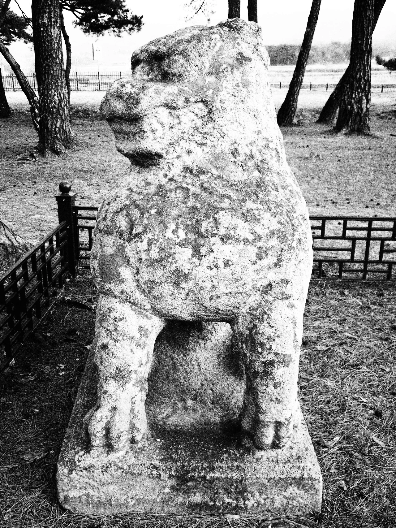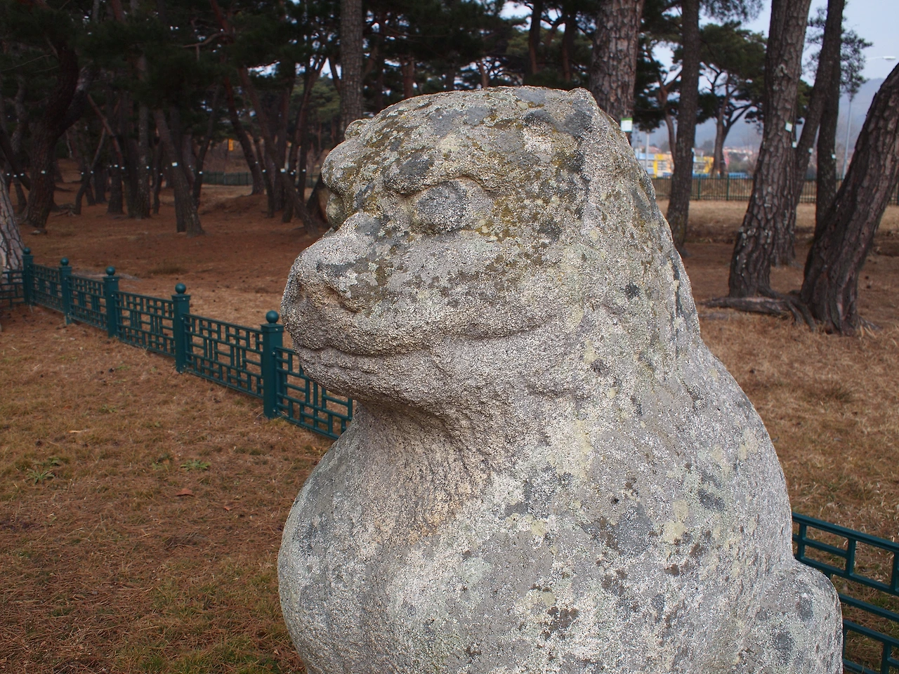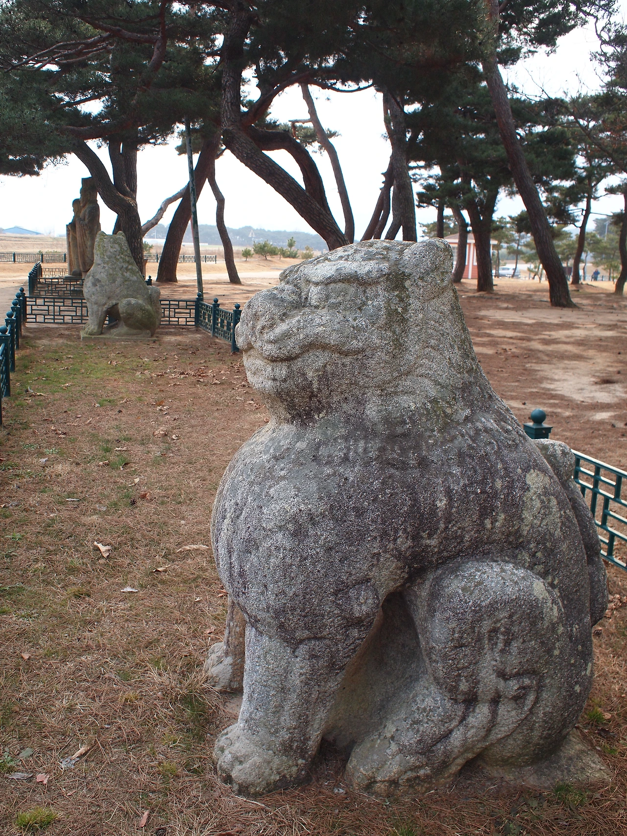 이제 흥분을 가라앉히고 다른 석물들도 좀 보자. 특히나 돌사자상. 보통 왕릉의 석수들이 다 근엄하거나 무서운 표정을 하고 있어 뻣뻣하기만 한데, 괘릉의 돌사자들은 웃는 녀석, 똘똘해보이는 녀석, 발로 바닥을 긁고 있는 녀석 등 그 표정이 천진난만하고 몸짓들이 다양해 정겹기만 하다. 근엄한 무인상과 묘한 댓구를 이룬다.