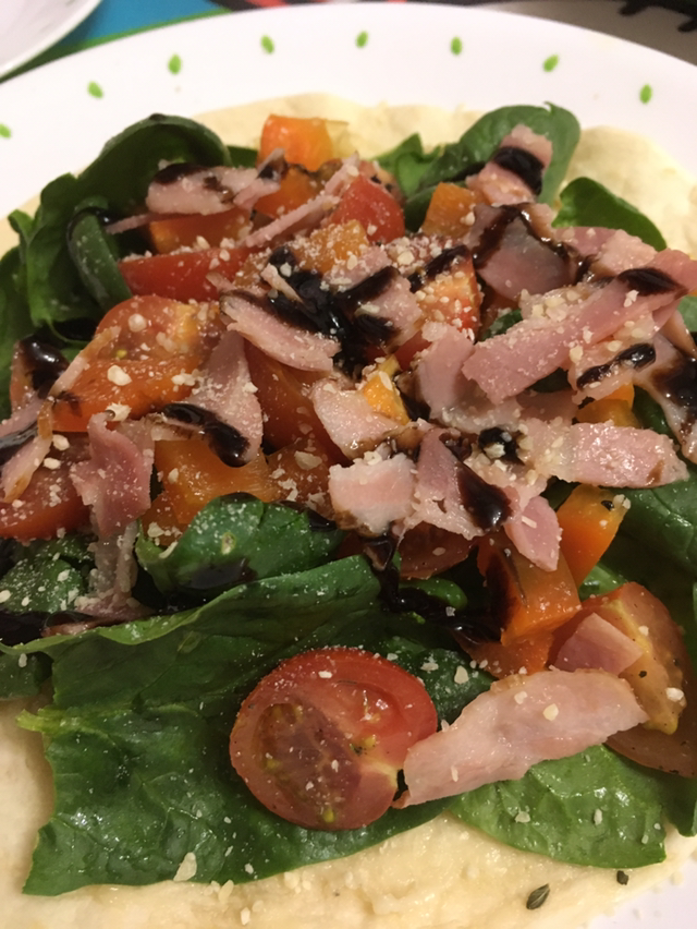 이제 주인공 등장. 시금치 듬뿍 올리자. 방울토마토랑 파프리카, 그리고 베이컨도 올리고. 치즈가루, 발사믹 글레이즈도 뿌려줬다. 요거트 있음 살짝 끼얹어도 좋다. 끝.