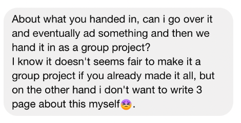 과제 마감 몇 시간 전. 내 보고서에 프리 라이딩 할 수 있겠냐고 물어오던 B : 과제를 할 수 있는 시간, 팀으로 하고 싶다면 사전에 논의해서 함께 할 수 있던 기간은 3주 이상이었다. 수업때 딱 한번 마주쳐 단순한 페친이었던 사람이 마감 당일 아래와 같은 메시지를 보내왔다. 그는 과제 주제가 바뀐 것도 내가 말해주기 전까지 모르고 있었더랬다. 주제와 분량이 조절된 것을 알려주며 혼자 할 수 있을걸? 이라고 이야기하니 사라졌다. 무임승차를 하는 빌런들을 'Free rider' 또는 'Dead weight(죽은 시체를 등에 지고 간다는 바이브의 표현인 듯. 조금 섬뜩하지만, 맞말...)' 라고 부르더라. 이렇게 당당하게 프리라이더를 자처하는 이를 보는 것도 오랜만이었다.