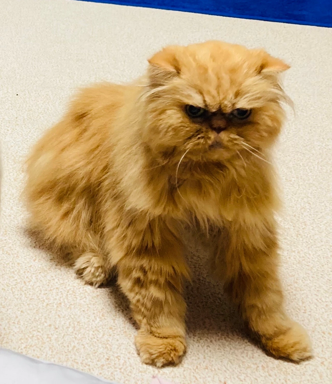 여기 가운데에 얼굴 폭 들어간 치즈냥이는 완전 인상파지? 놀랍게도 지금 간식을 먹고 기분이 좋은 상태야. 성격은 까칠해서 예전에는 잘 만지지 못했는데, 요즘은 할아버지가 돼서 조금 부드러워졌어. 나이가 이제 16살인가 그럴거야.