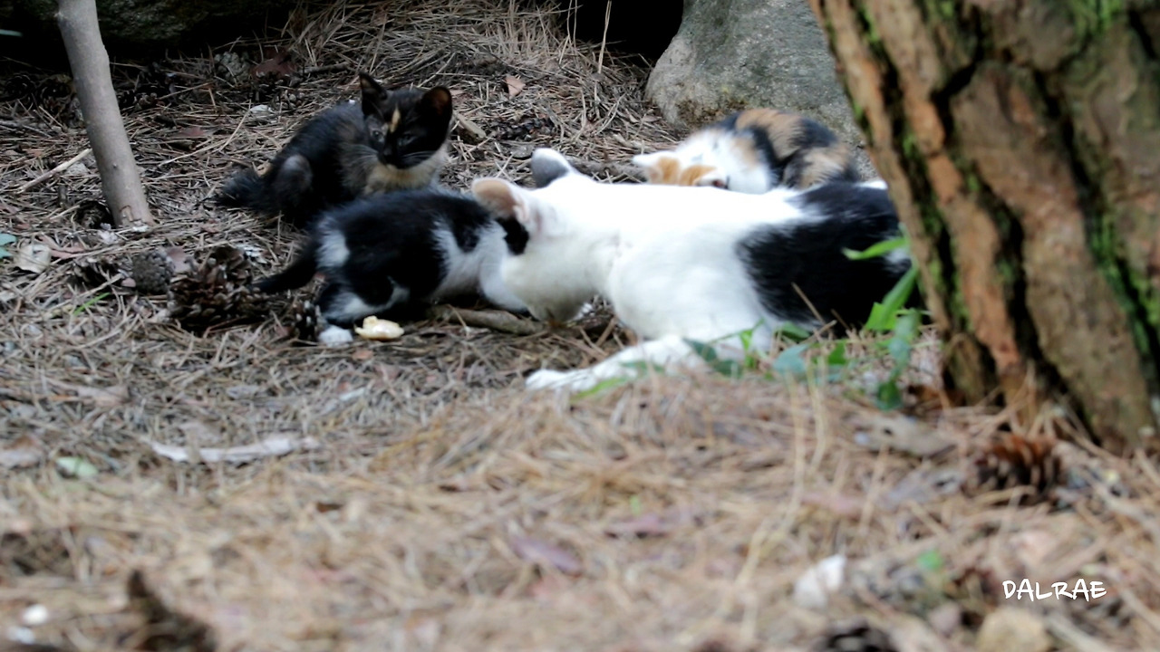 숲냥이 시절 엄마와 함께 지내고 있는 "달래" (뒤편 카오스 무늬 고양이)