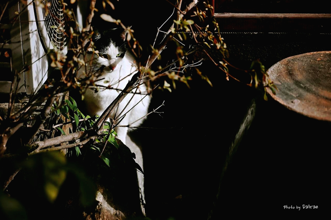 흰둥이는 다른 고양이들로부터 식당 입구 사료그릇을 지킵니다.