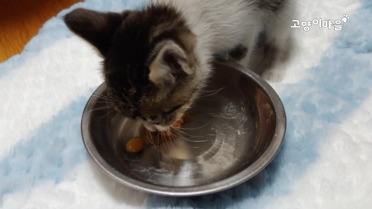 급한 대로 어린 고양이용 습식사료를 주니 배가 많이 고팠는지 허겁지겁 먹는 아기 고양이.